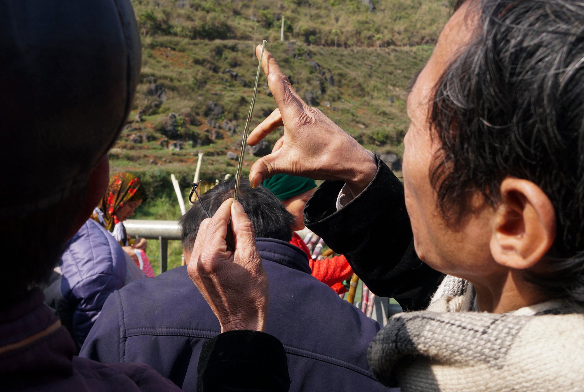 Tempat paling ramai adalah di Jembatan Can Ty 2, dengan ratusan orang bermain sesuatu dengan pohon tebu yang tingginya melebihi kepala mereka. Vang My Su, 32 tahun, etnis Mong, di komune Lung Tam (distrik Quan Ba) di dekatnya, mengatakan ini adalah permainan memotong tebu, yang disebut "lai cat chi" dalam bahasa Mong. Untuk menang, pemain harus menggunakan pisau untuk menandai (memotong) titik tengah dari dua takik pada tebu penantang. Jika potongannya di atas atau di bawah, pemain kalah.
