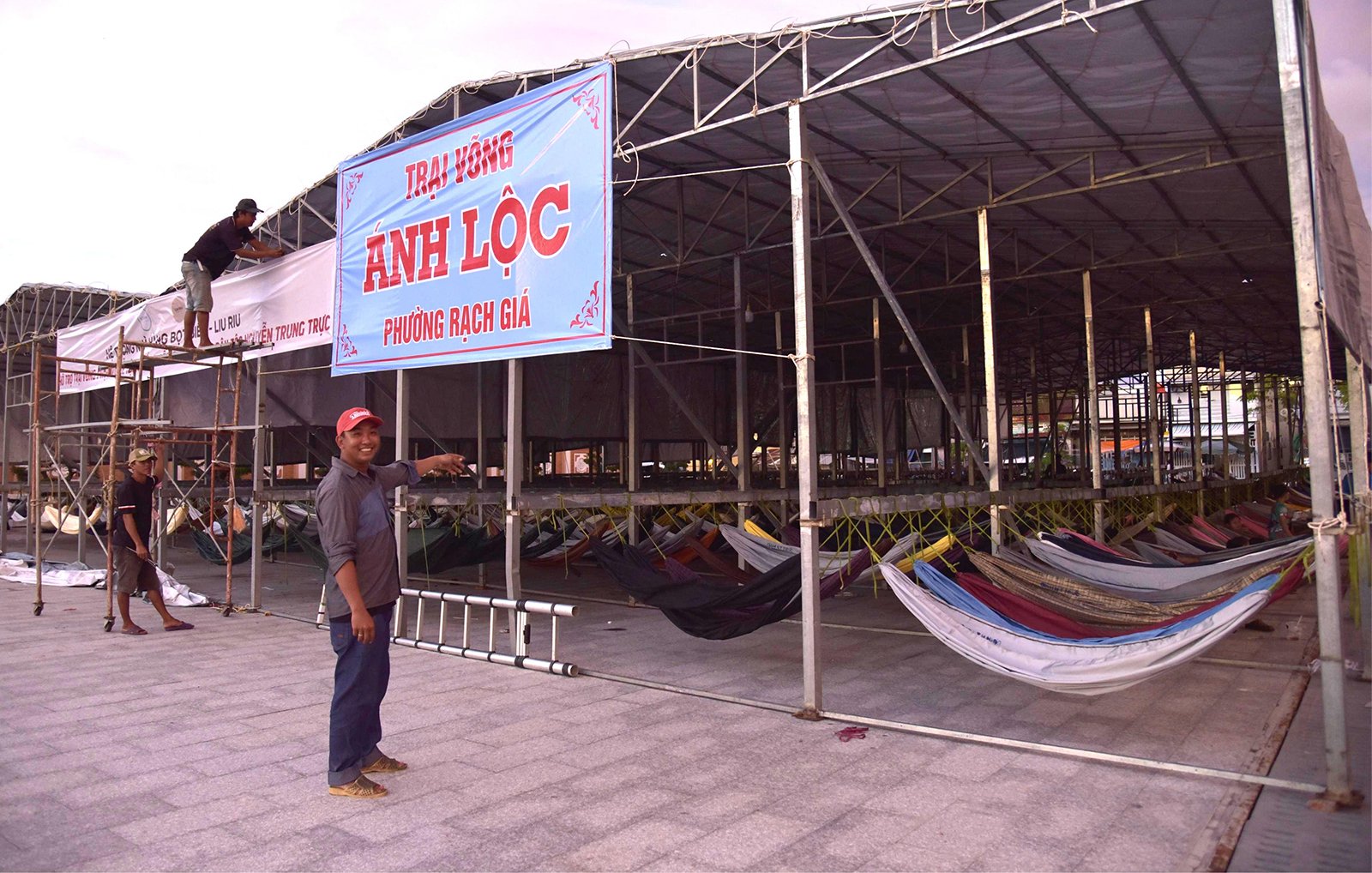 Kamp hammock di depan Kuil Peringatan Pahlawan, Martir, dan Tokoh Berjasa Provinsi di Kawasan Perkotaan Reklamasi Laut Barat Laut, Distrik Rach Gia, melayani 1.000 hammock. Foto: AN LAM