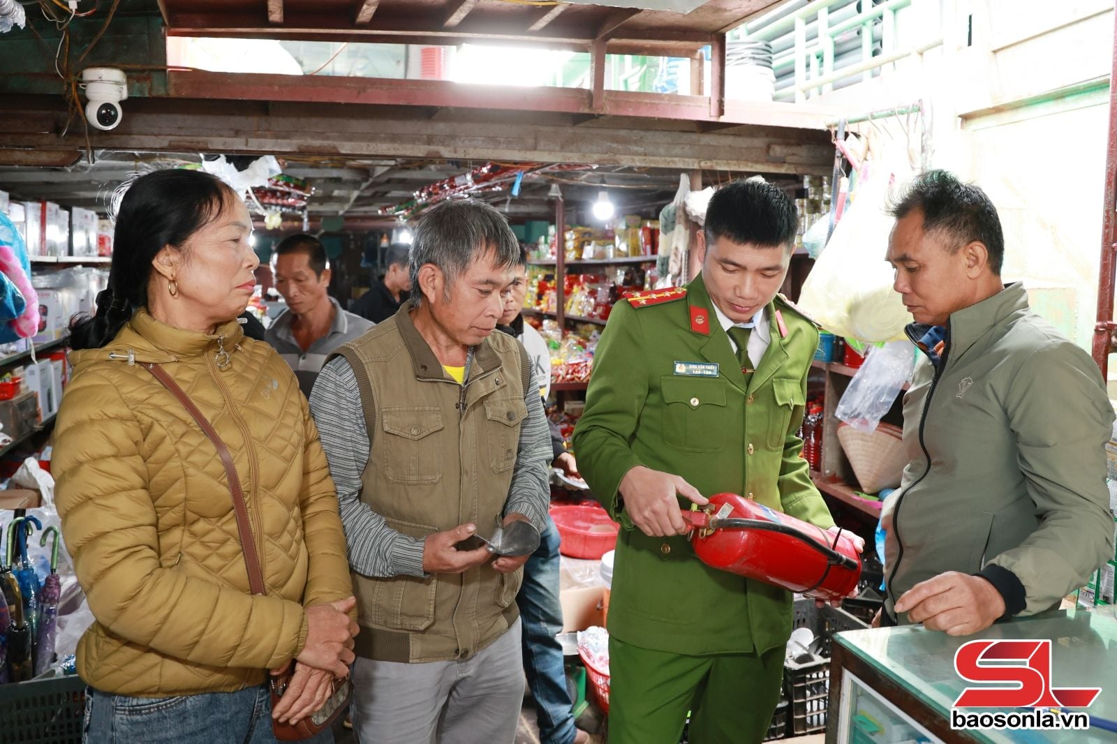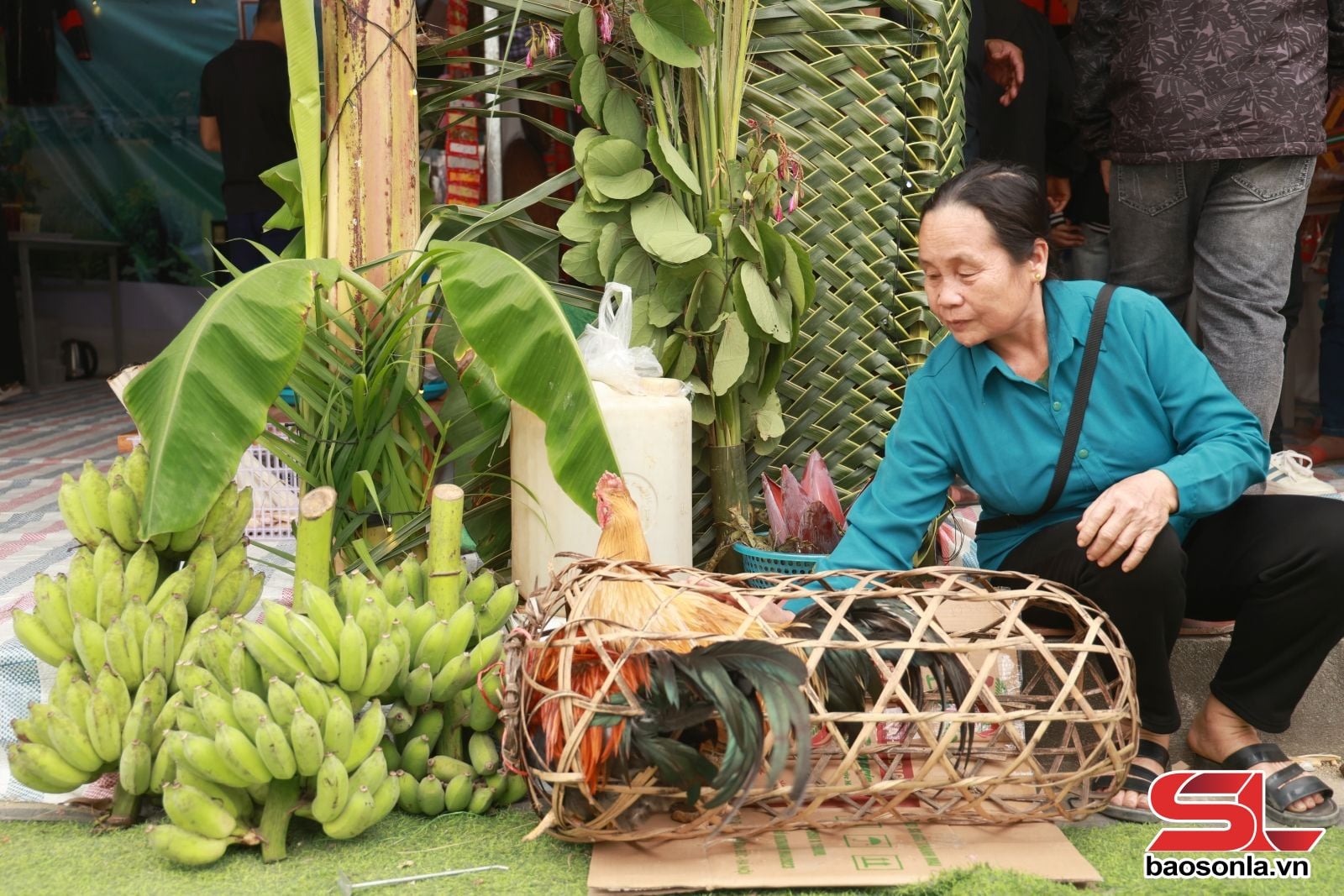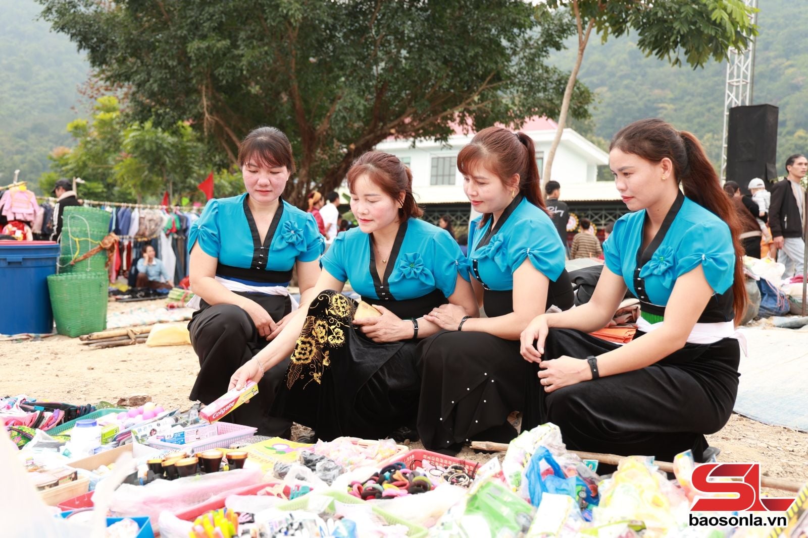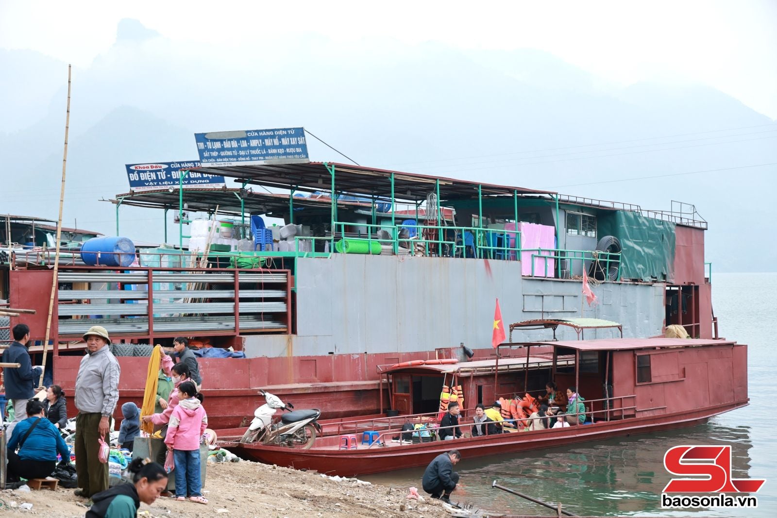 Pasar ini terletak di lahan di samping dermaga sungai. Luasnya memang tidak terlalu besar, tetapi cukup untuk menampung kios-kios yang memajang dan menarik pembeli. Sejak pagi, warga setempat telah berdatangan untuk menata dan memajang produk-produk lokal, mulai dari sayuran, rebung kering, madu hutan, ikan kering, siput batu, kue kentang tradisional, hingga brokat khas suku Muong. Di sungai, kapal-kapal kargo milik pemilik kapal dagang dari Hai Phong, Phu Tho, dan Hanoi berlabuh. Setiap kapal kargo bagaikan supermarket keliling di atas air, berlayar selama sebulan penuh di Sungai Da, dari Phu Tho ke pasar-pasar di sepanjang sungai di Son La. Setelah itu, mereka kembali untuk mengemas barang dagangan mereka.