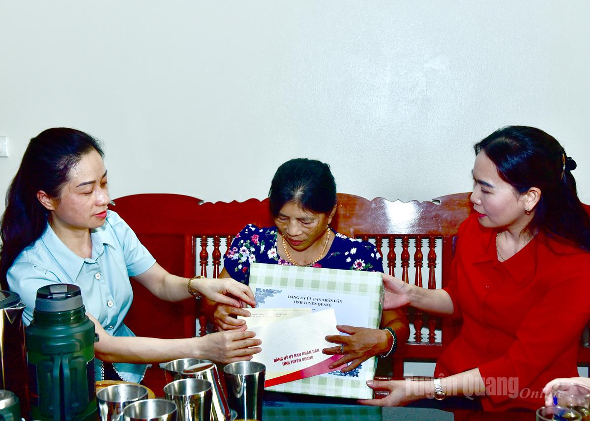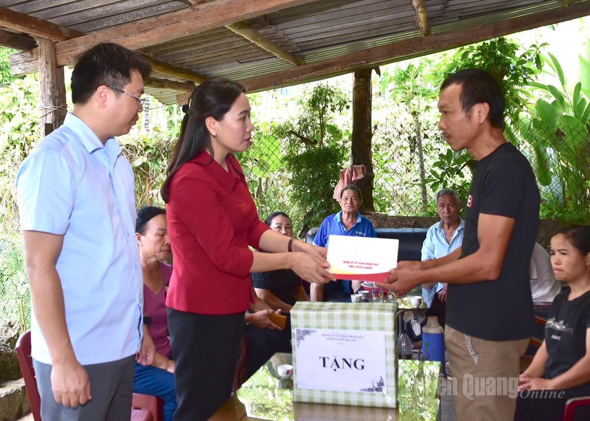 Wakil Sekretaris Tetap Komite Partai Provinsi Nong Thi Bich Hue dan para pemimpin komune Na Hang memberikan hadiah dan dukungan kepada Ibu Dao Thi Theu, di desa 2, komune Na Hang. |