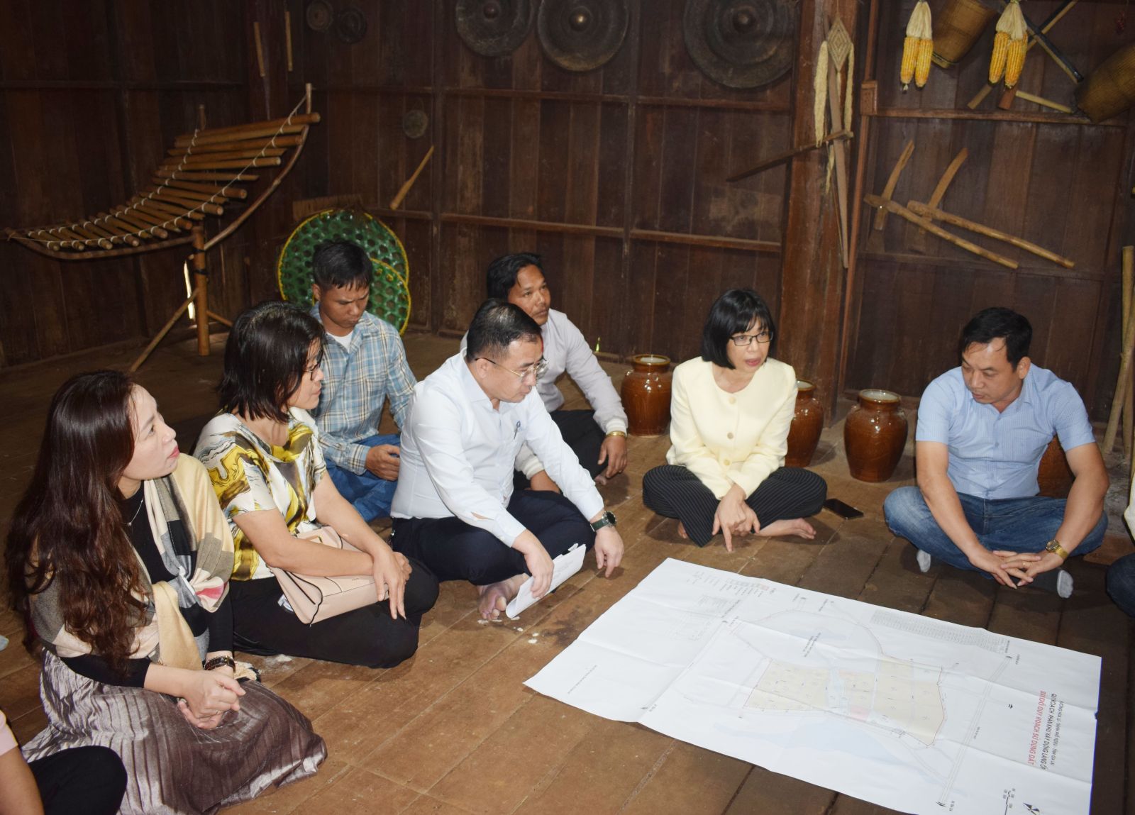 Wakil Ketua Komite Rakyat Provinsi Nguyen Thi Thanh Lich mendengarkan laporan pemimpin distrik Pleiku tentang pekerjaan perencanaan pengembangan pariwisata masyarakat di desa Op pada waktu mendatang.