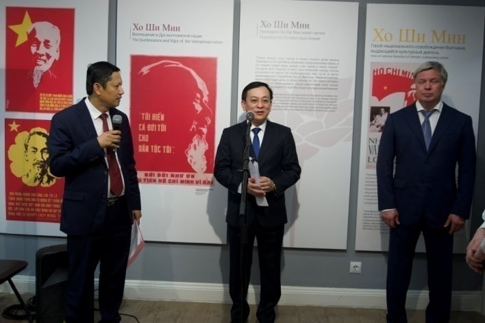 Dr. Vu Manh Ha, Direktur Museum Ho Chi Minh, menyampaikan pidato pembukaan pameran “Potret Ho Chi Minh - Perspektif dari Poster Propaganda. 1969-2011” yang diselenggarakan bersama oleh Museum Ho Chi Minh dan Situs Peringatan VILenin di Ulyanovsk, Federasi Rusia, Juli 2024. Foto: BTHCM