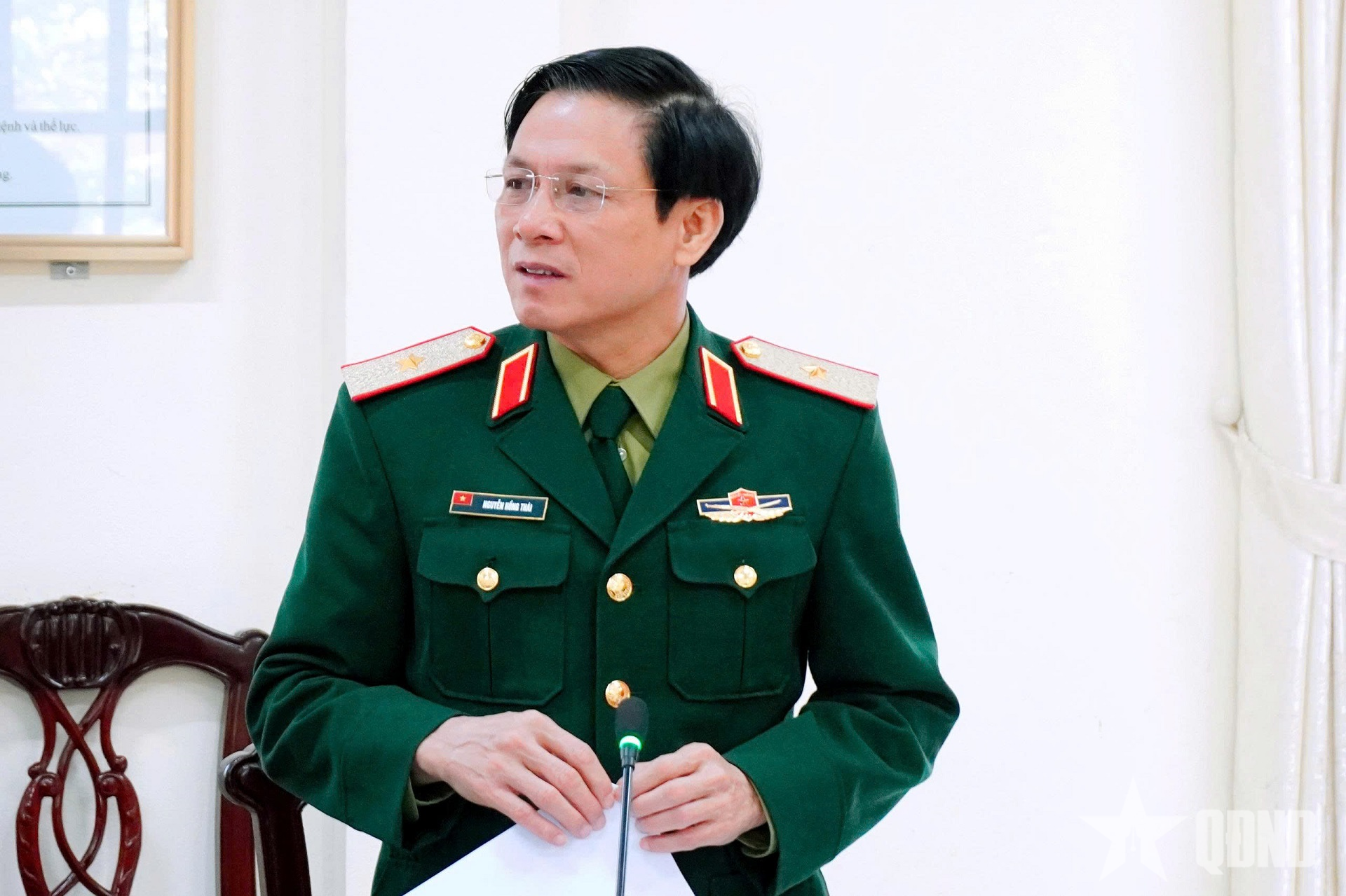 | Mayor Jenderal Nguyen Hong Thai, Wakil Komisaris Politik Wilayah Militer 2, memberikan pidato di konferensi tersebut. |