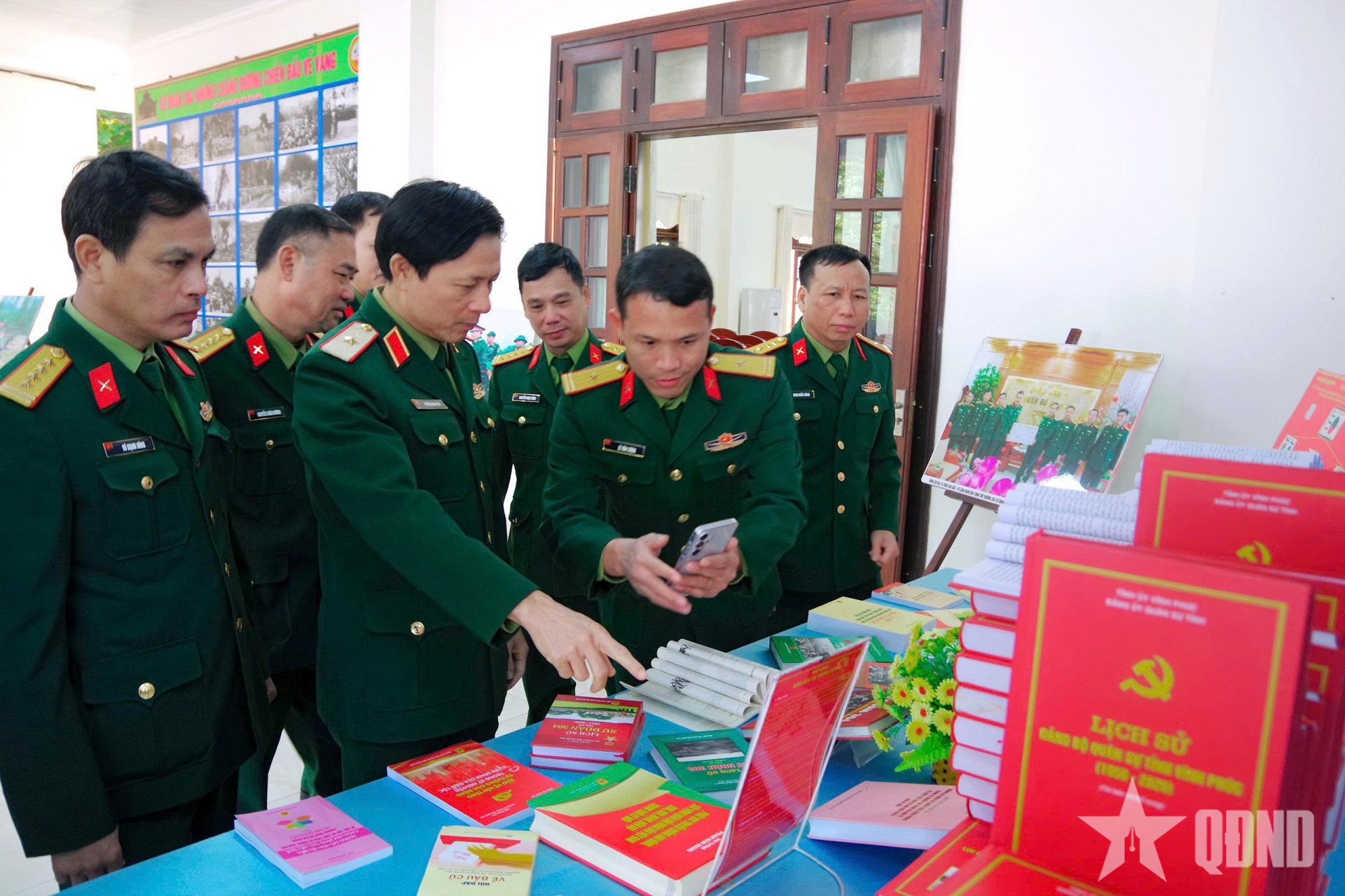 | Para pemimpin Daerah Militer 2 dan delegasi mengunjungi stan yang memamerkan produk kreatif para pemuda Divisi 304. |