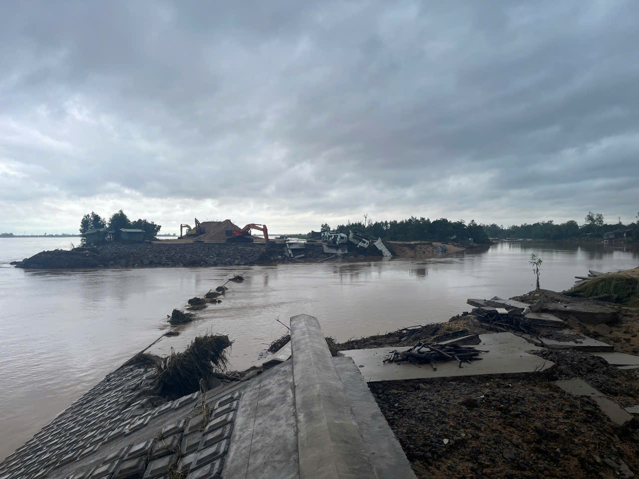 Catatan reporter Thanh Nien di tempat kejadian: Banjir Jembatan Dinh Ong (komune Tay Hoa) merusak tanggul, mengalir ke sungai baru.