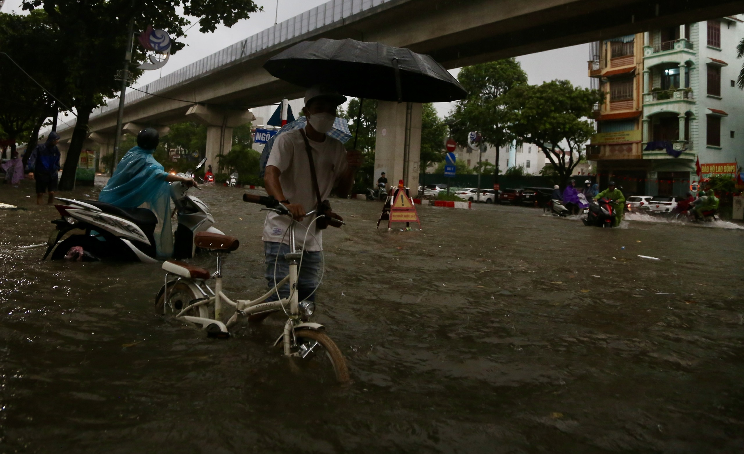 Jalan Nguyen Co Thach (Tu Liem, Hanoi) terendam banjir. Permukaan jalan berubah menjadi sungai, air meluap ke trotoar. Orang-orang mendorong sepeda motor mereka melewati area banjir agar tidak mogok. Banyak yang berteriak-teriak mencari tempat parkir yang lebih tinggi.