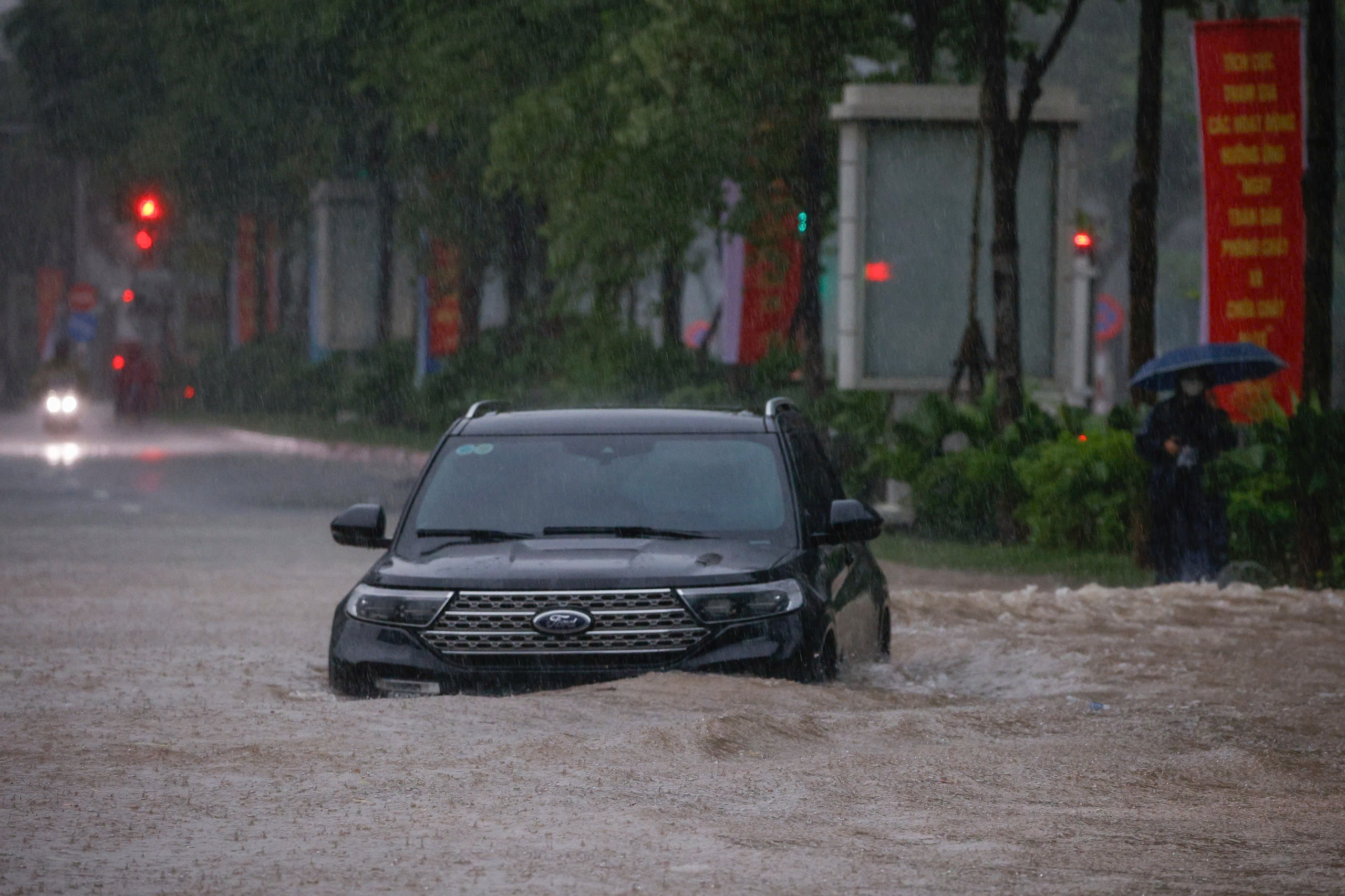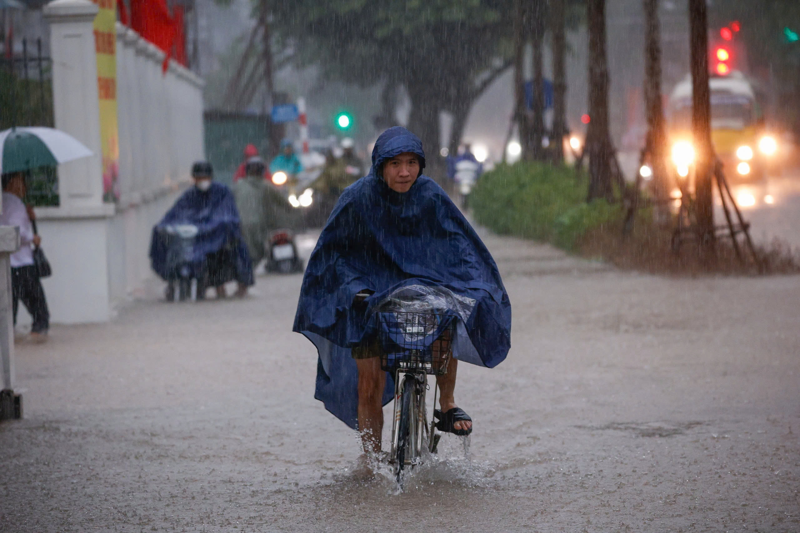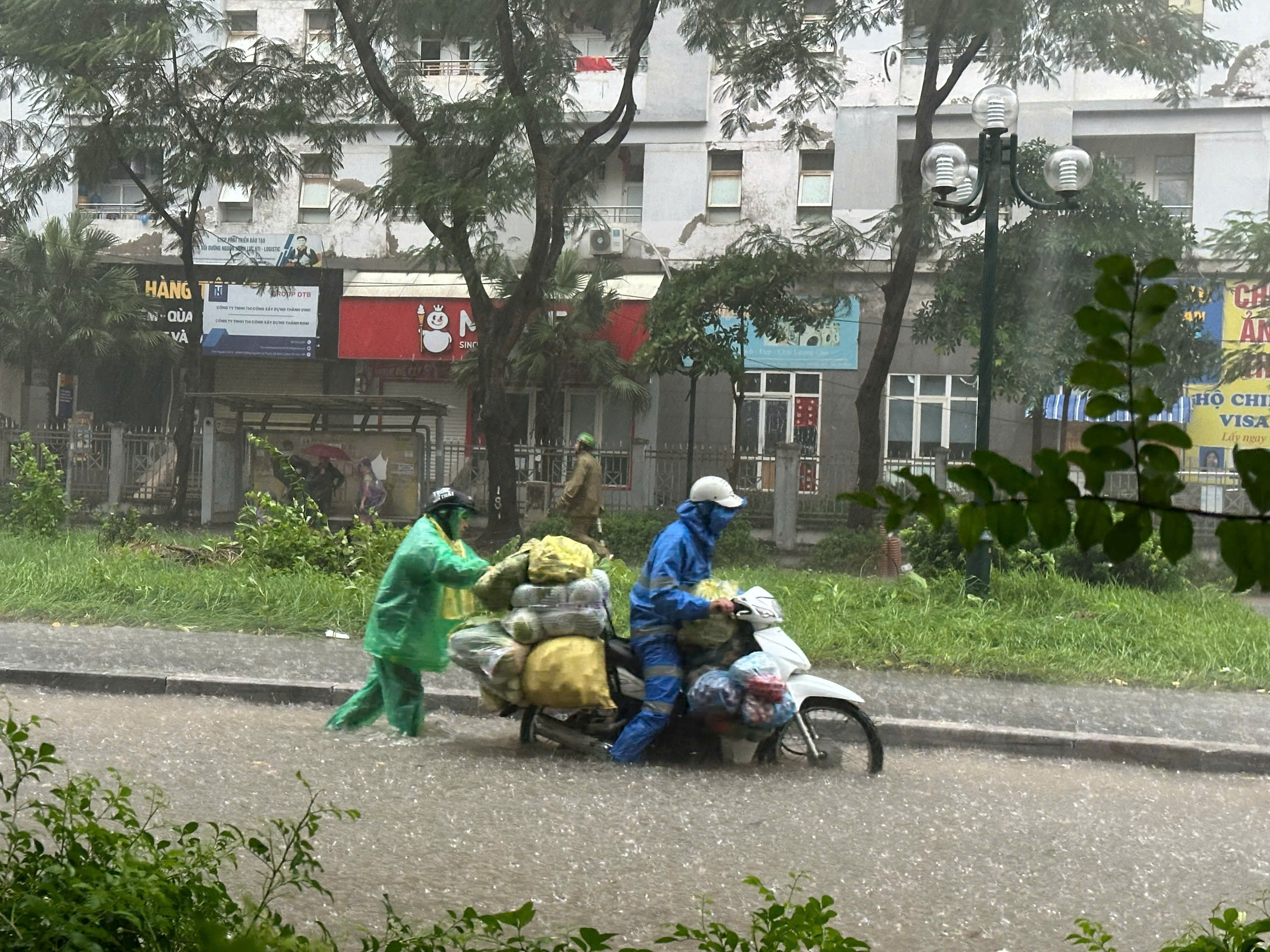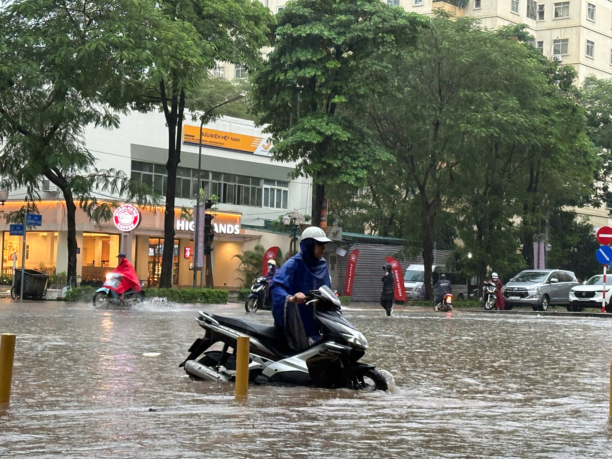 Sekitar pukul 07.20, hujan deras kembali turun di wilayah barat Hanoi. Jalan Quang Trung terendam air.