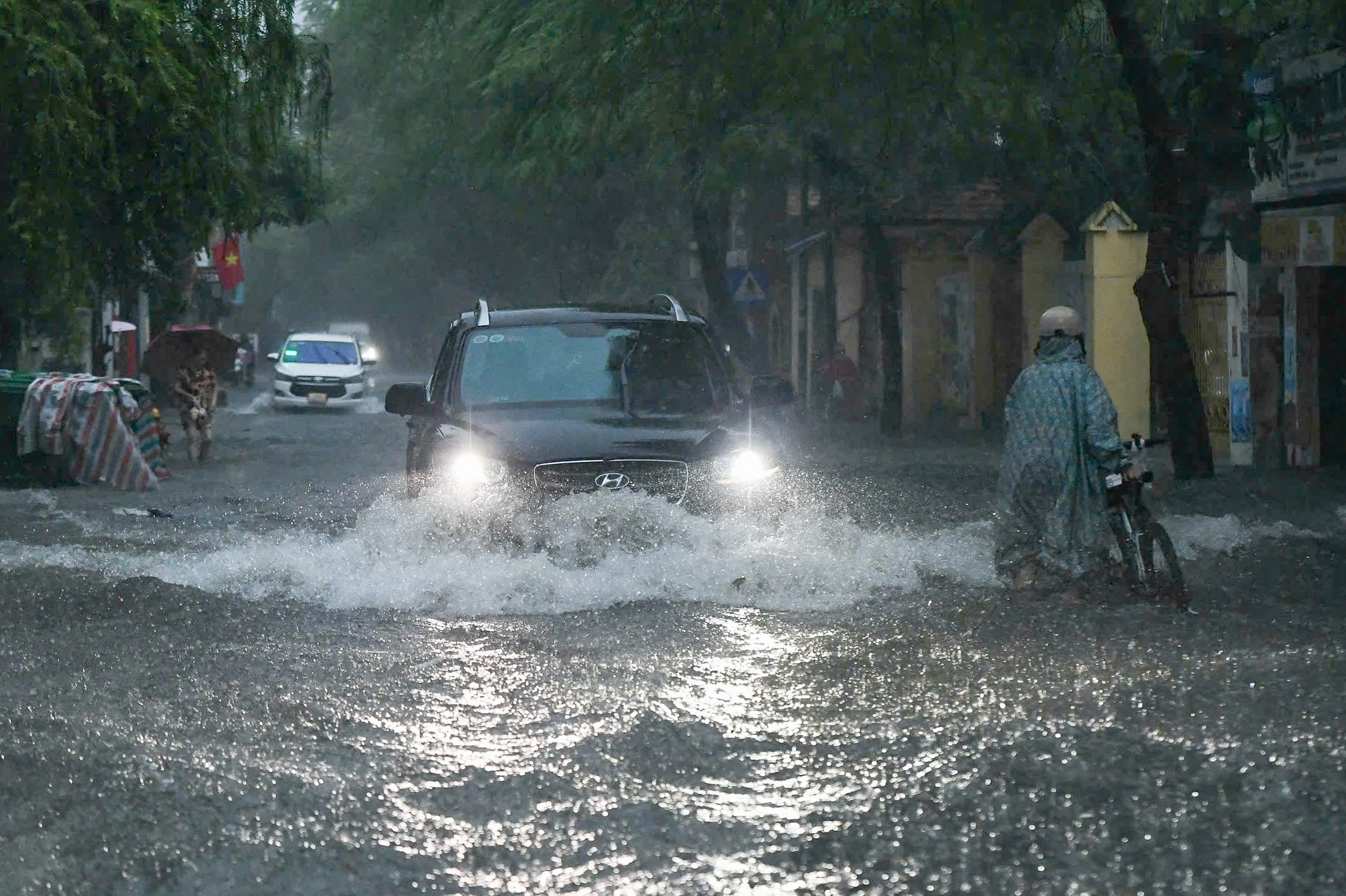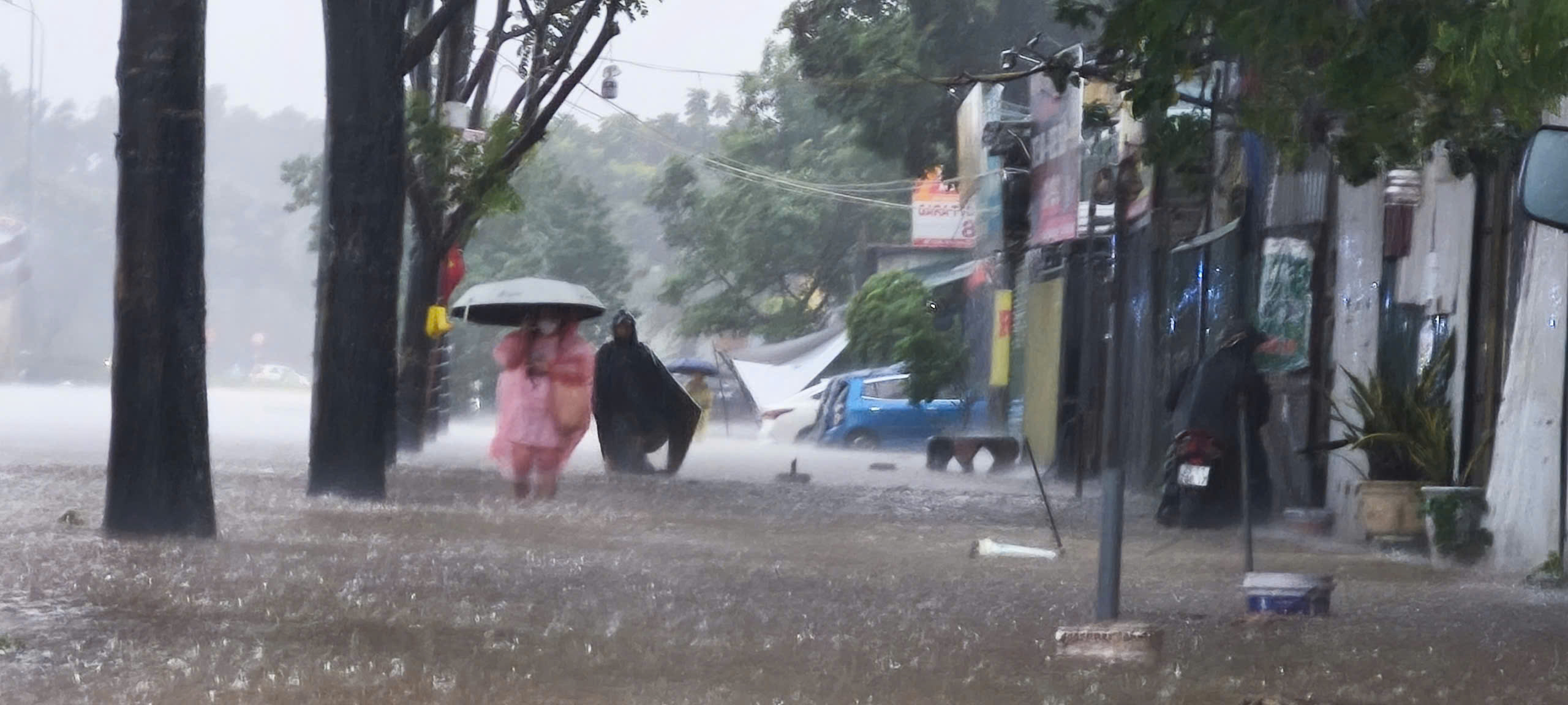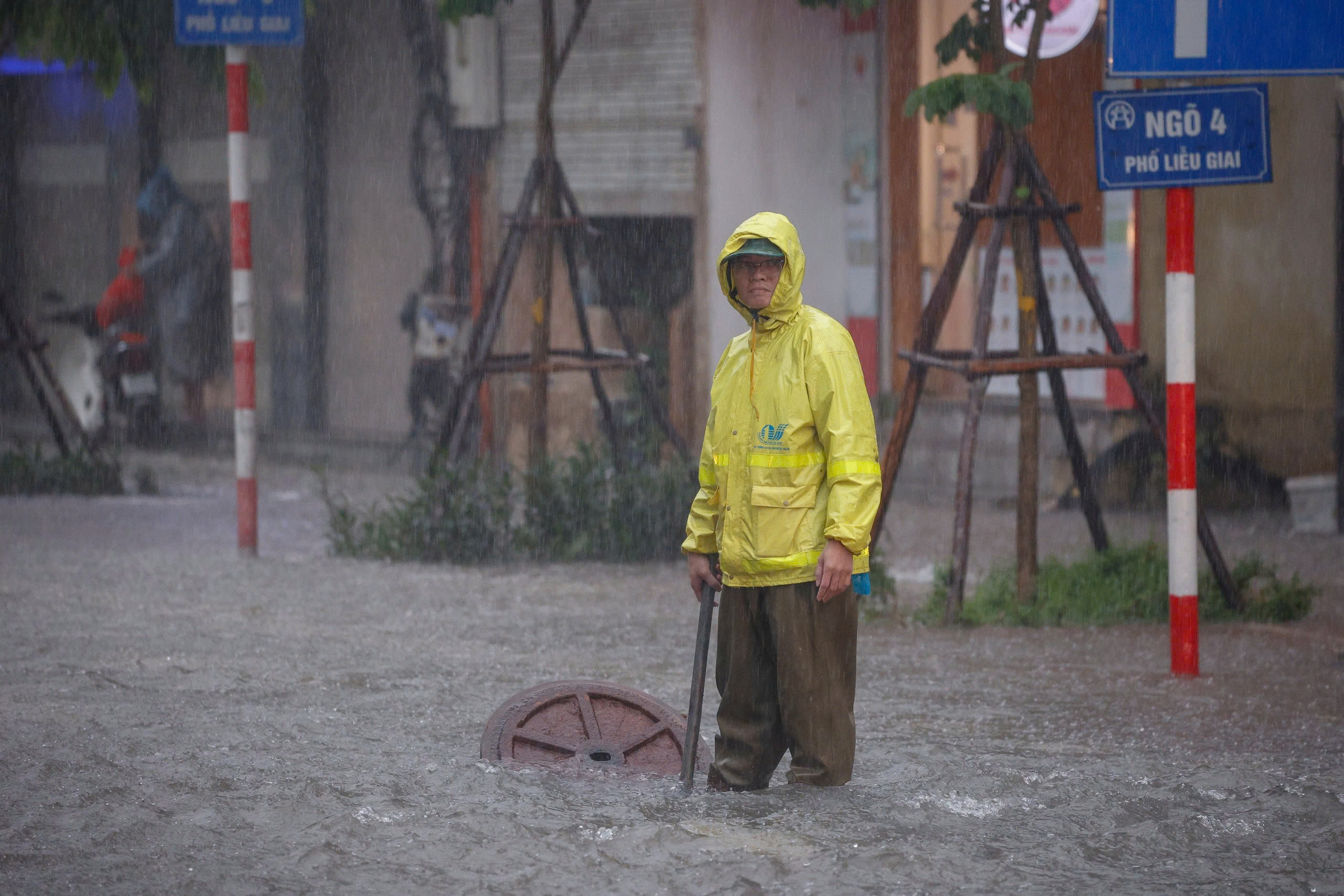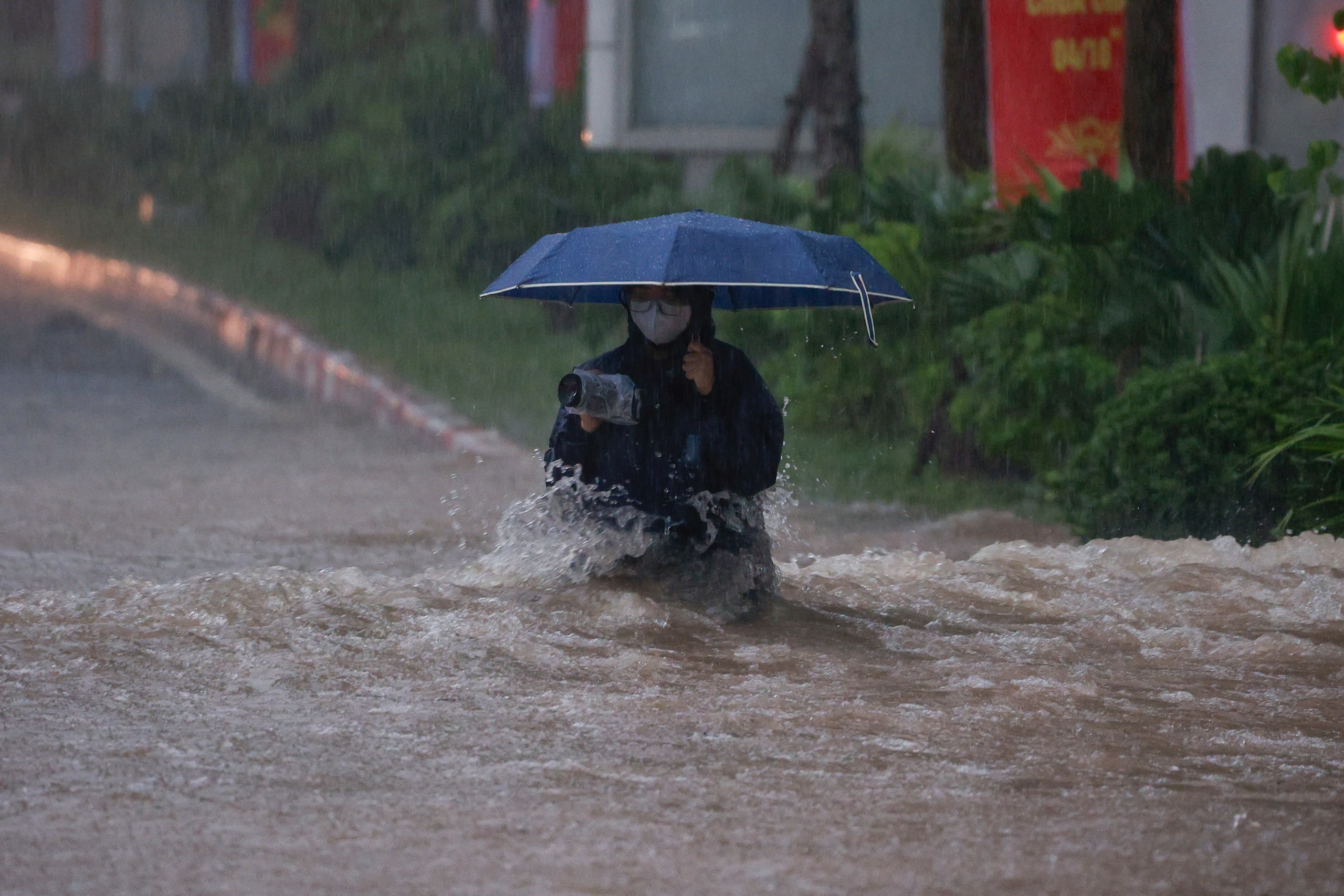 Sekitar pukul 07.20, hujan deras kembali turun di wilayah barat Hanoi. Jalan Quang Trung terendam air.