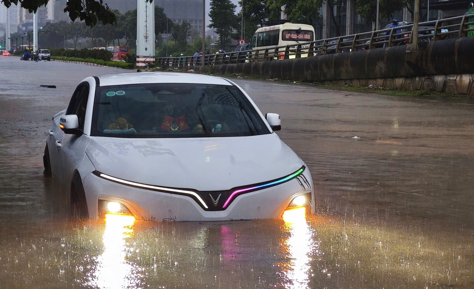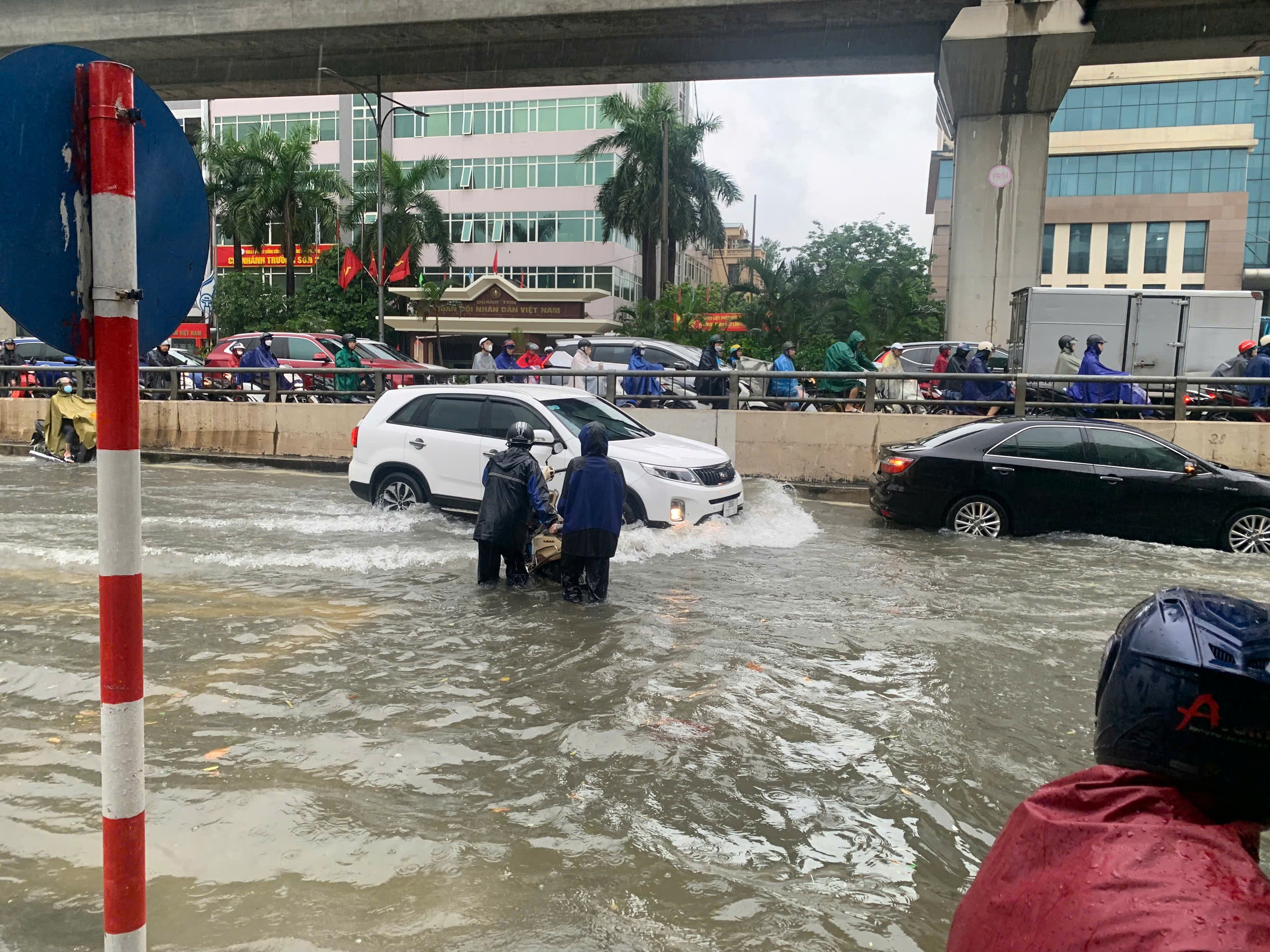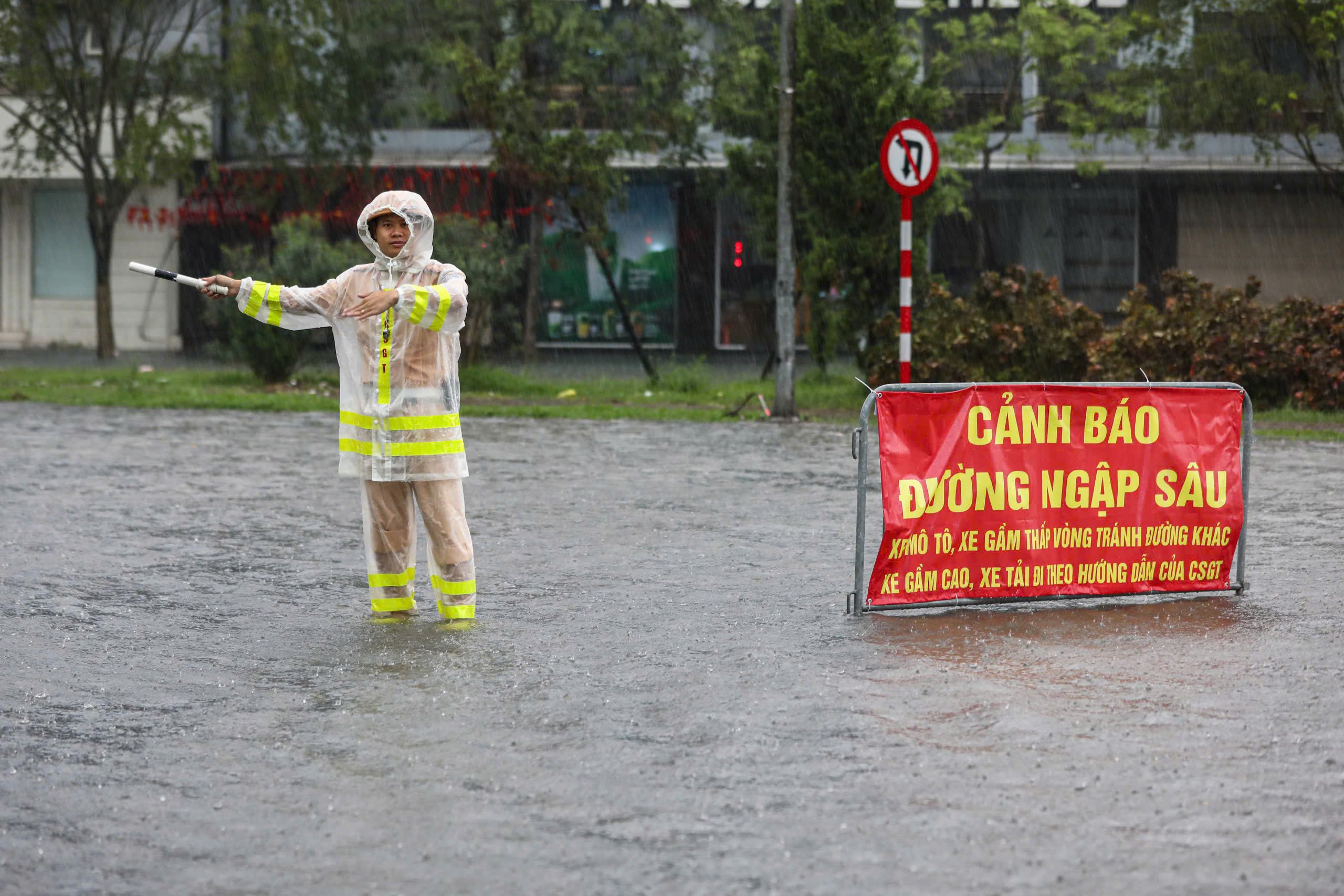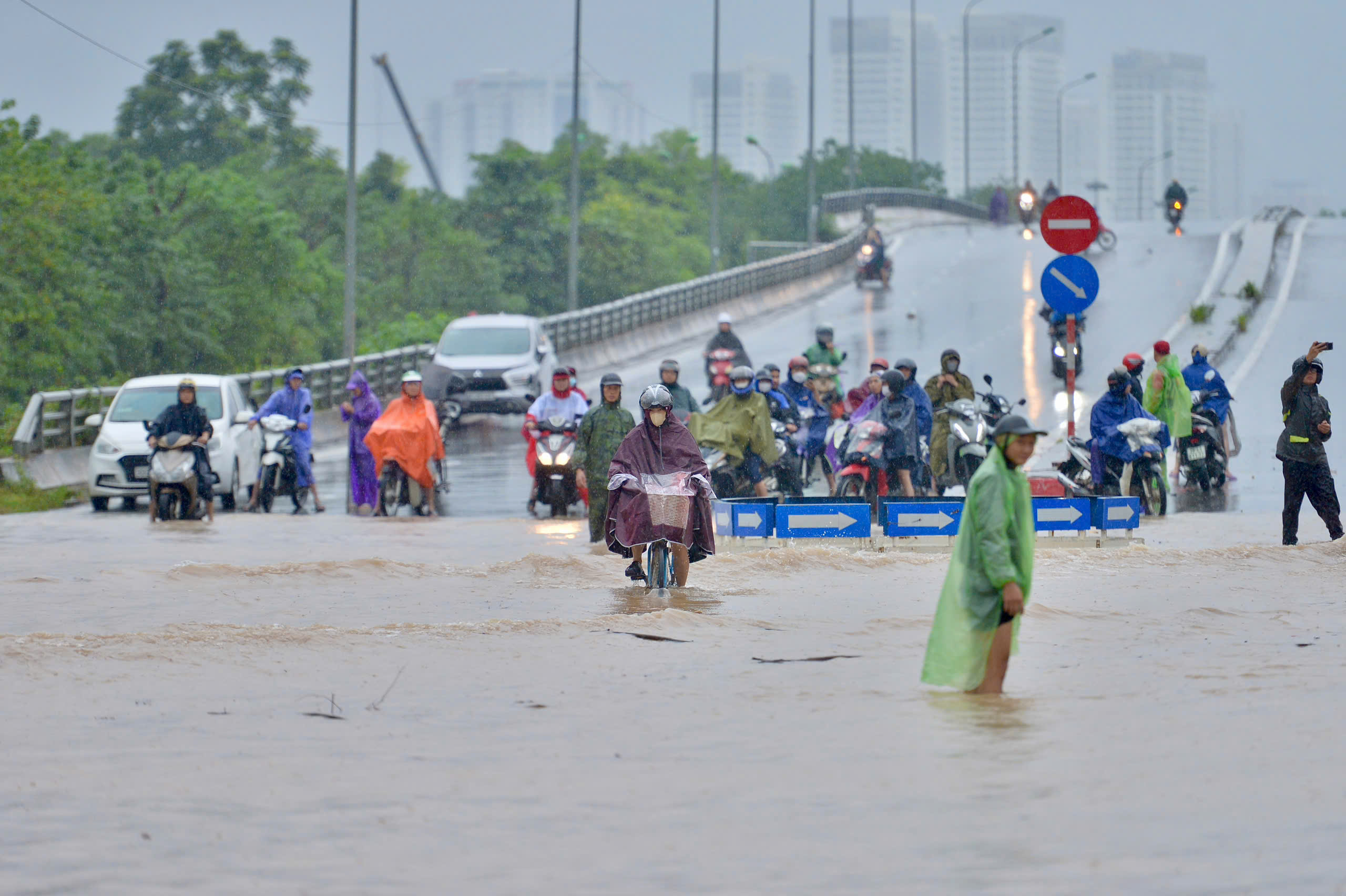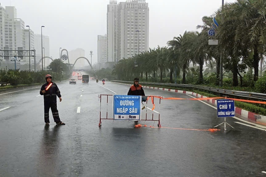 Jalan Tran Thai Tong (di depan gerbang Komite Rakyat Distrik Cau Giay) terendam banjir setinggi 1 meter. Kendaraan terpaksa naik ke trotoar untuk melewati bagian ini.
