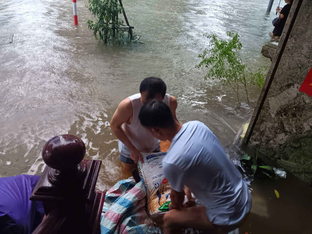 Pukul 07.30, Jalan Tran Thai Tong (di depan gerbang Komite Rakyat Kelurahan Cau Giay) terendam banjir setinggi 1 meter. Kendaraan terpaksa naik ke trotoar untuk melewati ruas jalan ini.