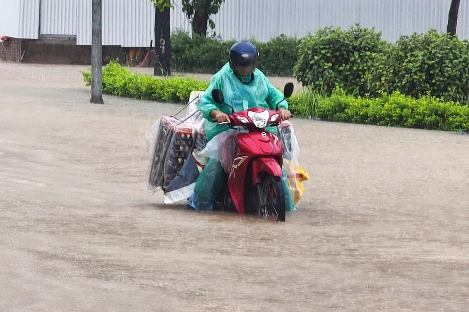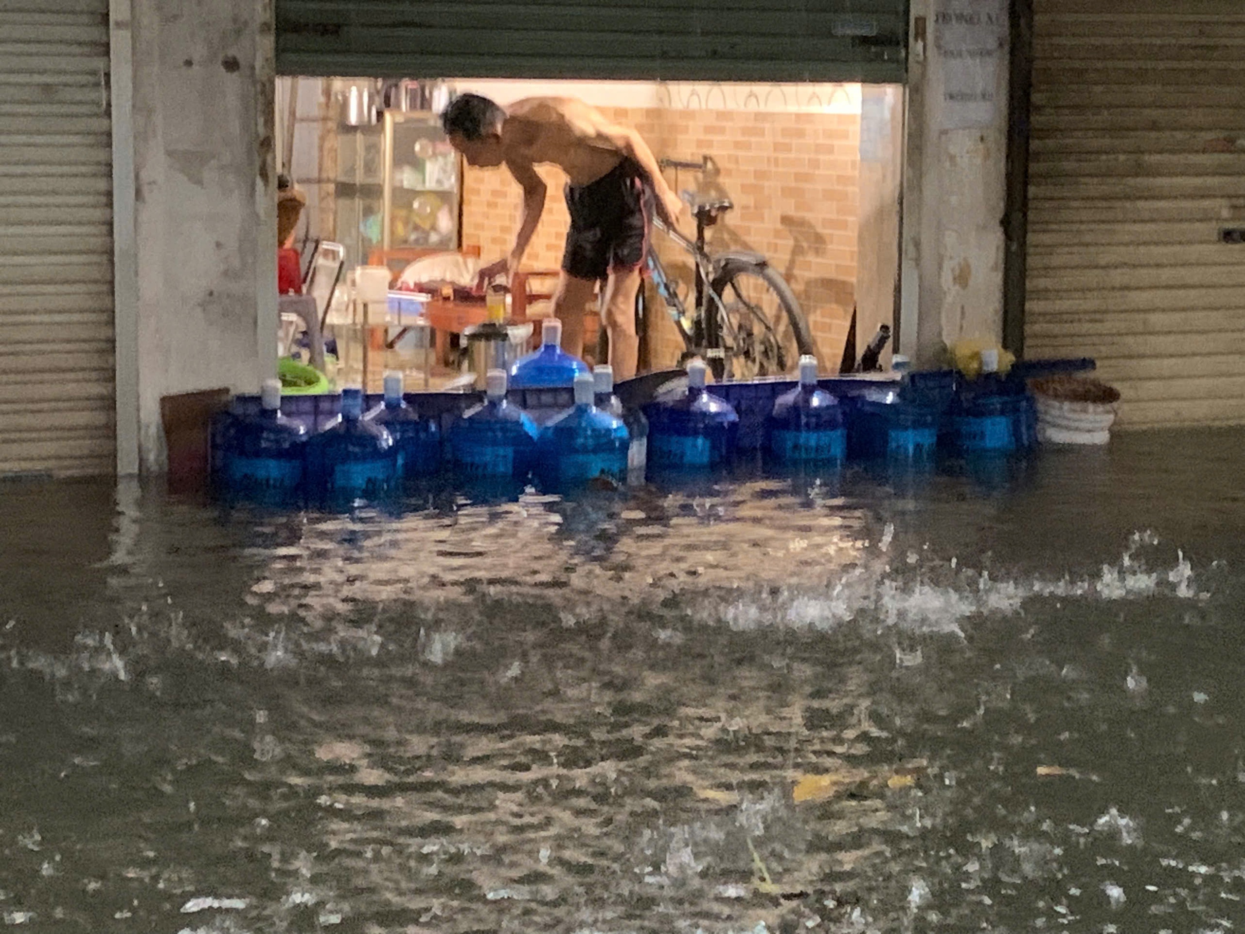 Jalan Nguyen Quy Duc terendam banjir dengan cepat.