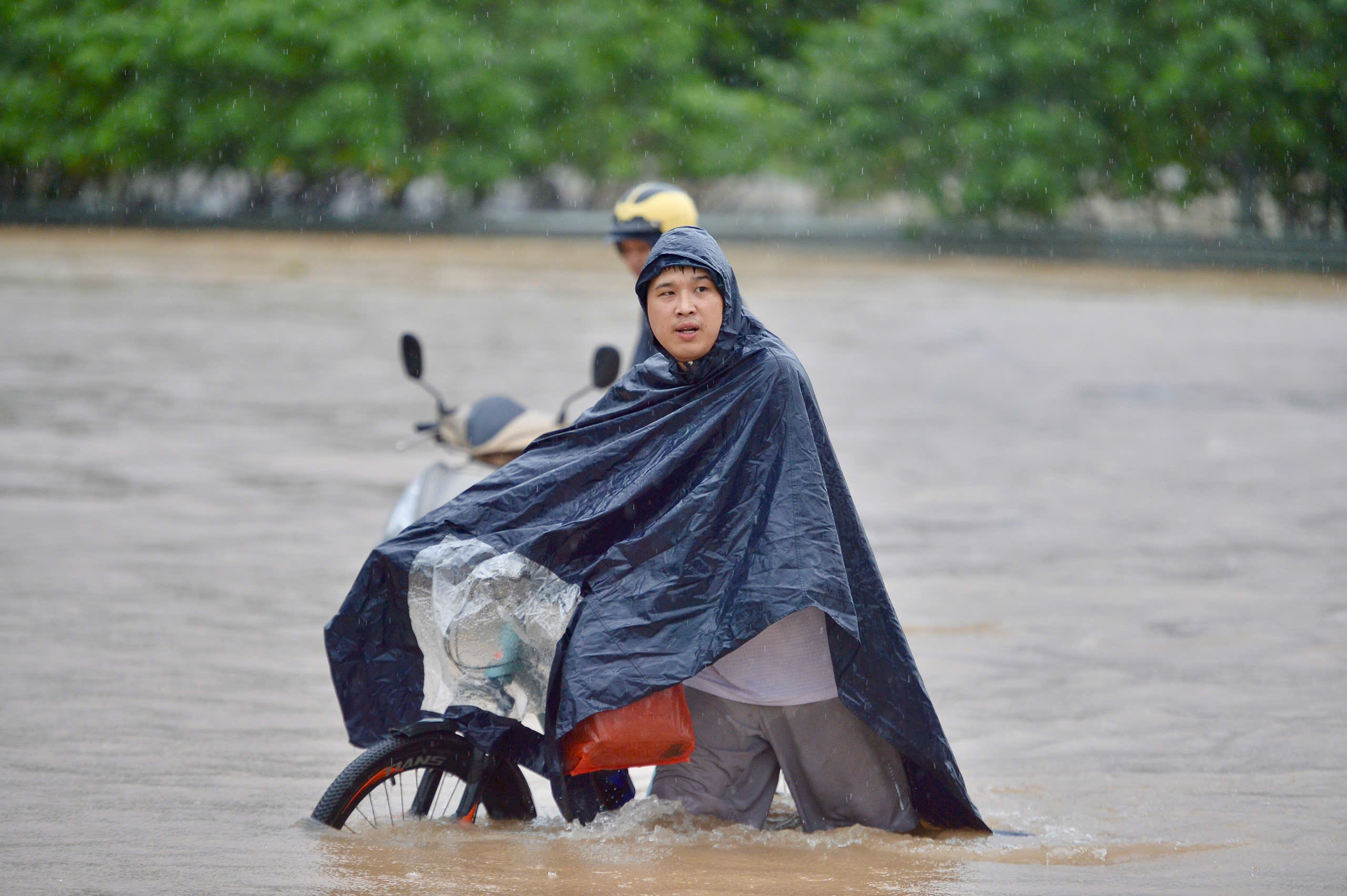 Masyarakat harus berjalan kaki menggunakan sepeda motor melewati bagian jalan yang tergenang banjir di Jalan Nguyen Co Thach.