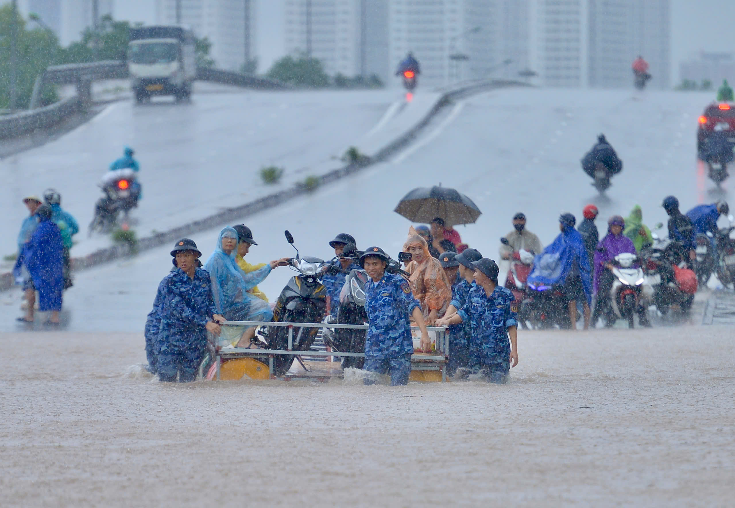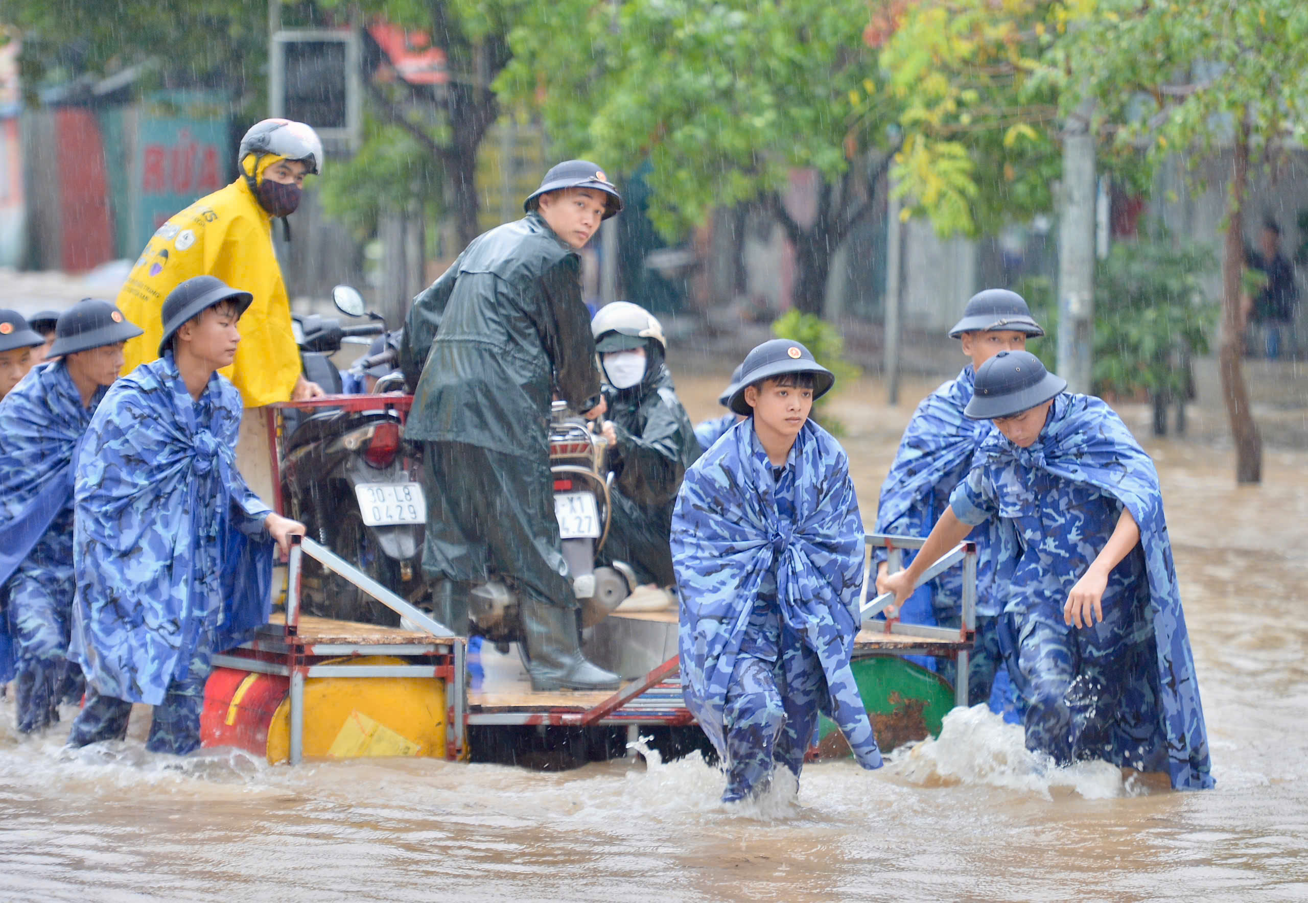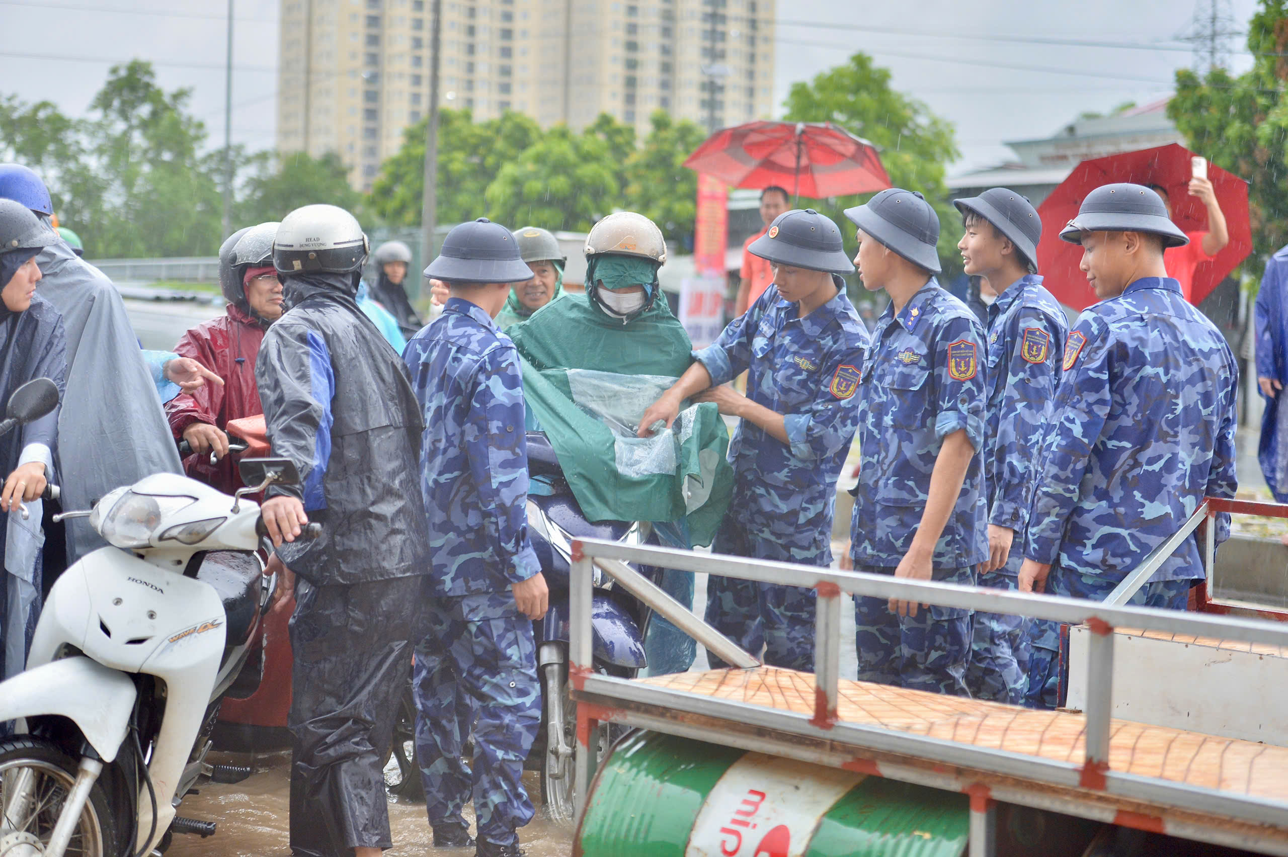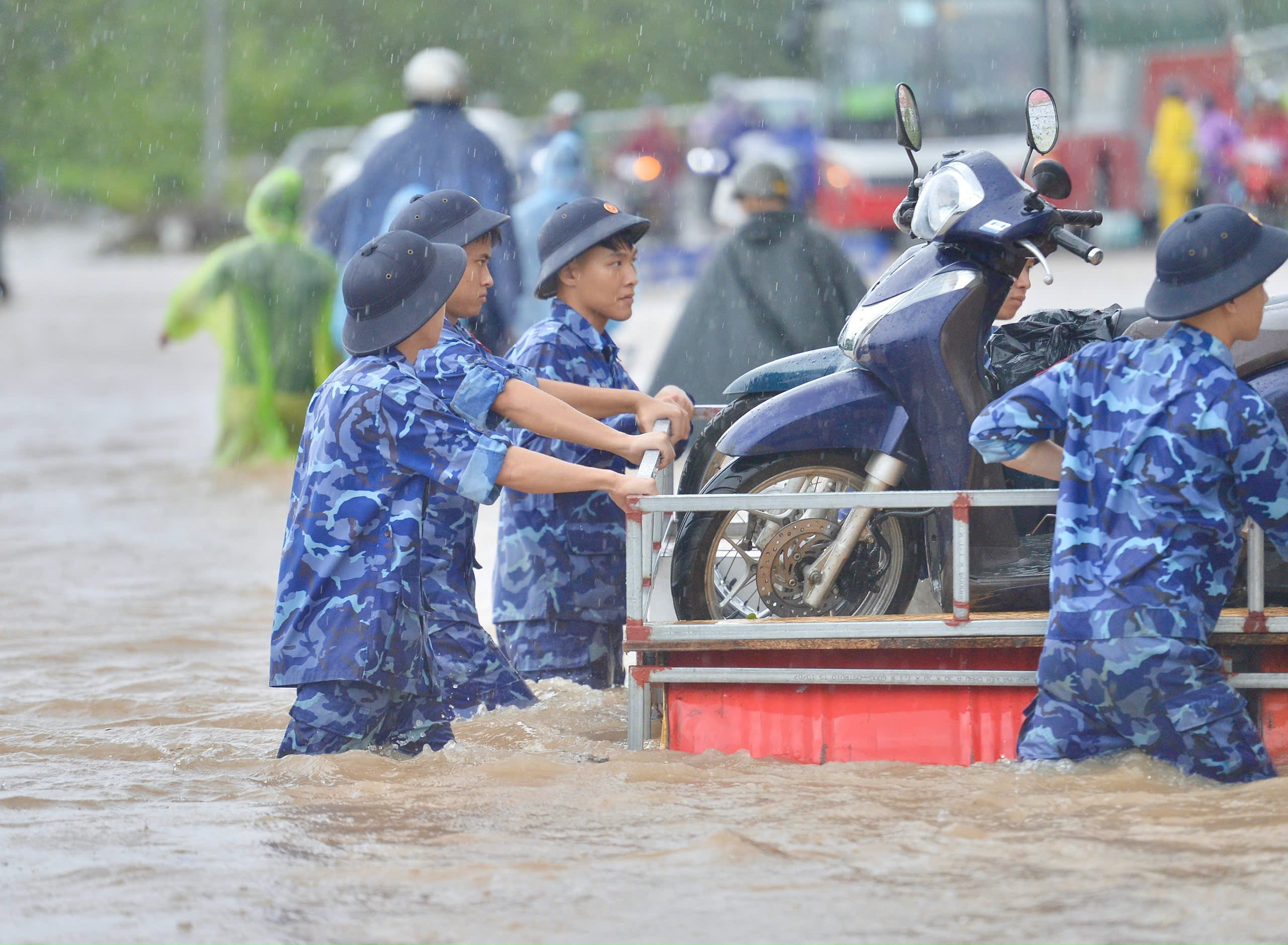 Berbicara kepada Thanh Nien , Kapten Nguyen Quoc Viet, Kapten Komando Penjaga Pantai, mengatakan bahwa unit tersebut mengirimkan 3 tim (setiap tim beranggotakan sekitar 12-15 orang) untuk bergiliran membantu mengangkut warga melewati daerah banjir. Setiap shift berlangsung sekitar 1 jam.