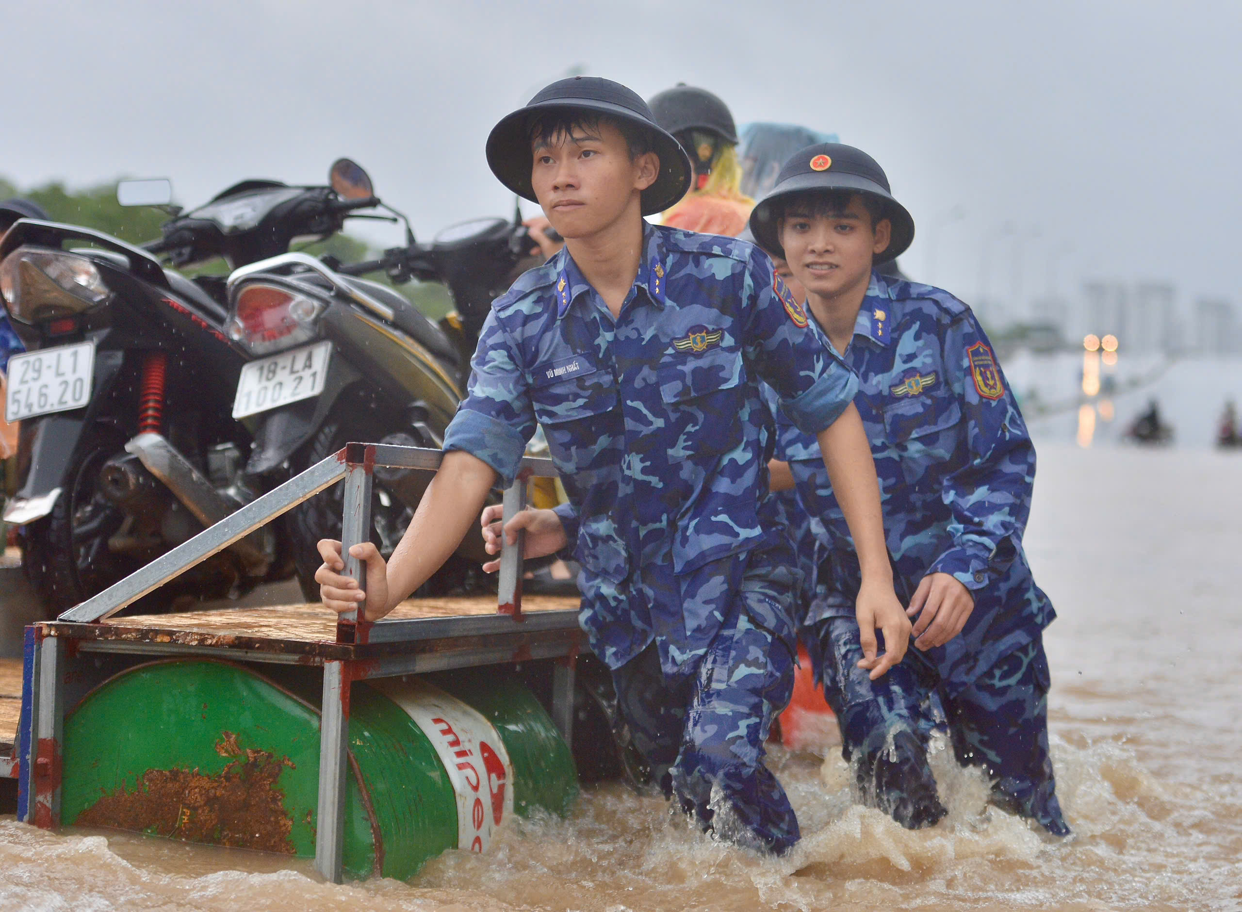 Di Jalan Thang Long, Komando Penjaga Pantai mengirimkan sekelompok tentara untuk berjaga, membantu warga melewati daerah yang terendam banjir. Markas unit ini juga berada di rute ini.