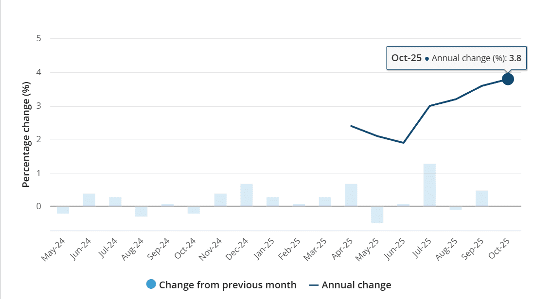 オーストラリア統計局(ABS)が発表した2025年10月の消費者物価指数(CPI)は3.8%(前月は3.6%)となり、オーストラリアのインフレ率は引き続き上昇する兆候を示しています。このように、オーストラリアのインフレ状況はここ数ヶ月で再び深刻化しており、家計支出だけでなく中央銀行の金融政策にも影響を与えています。