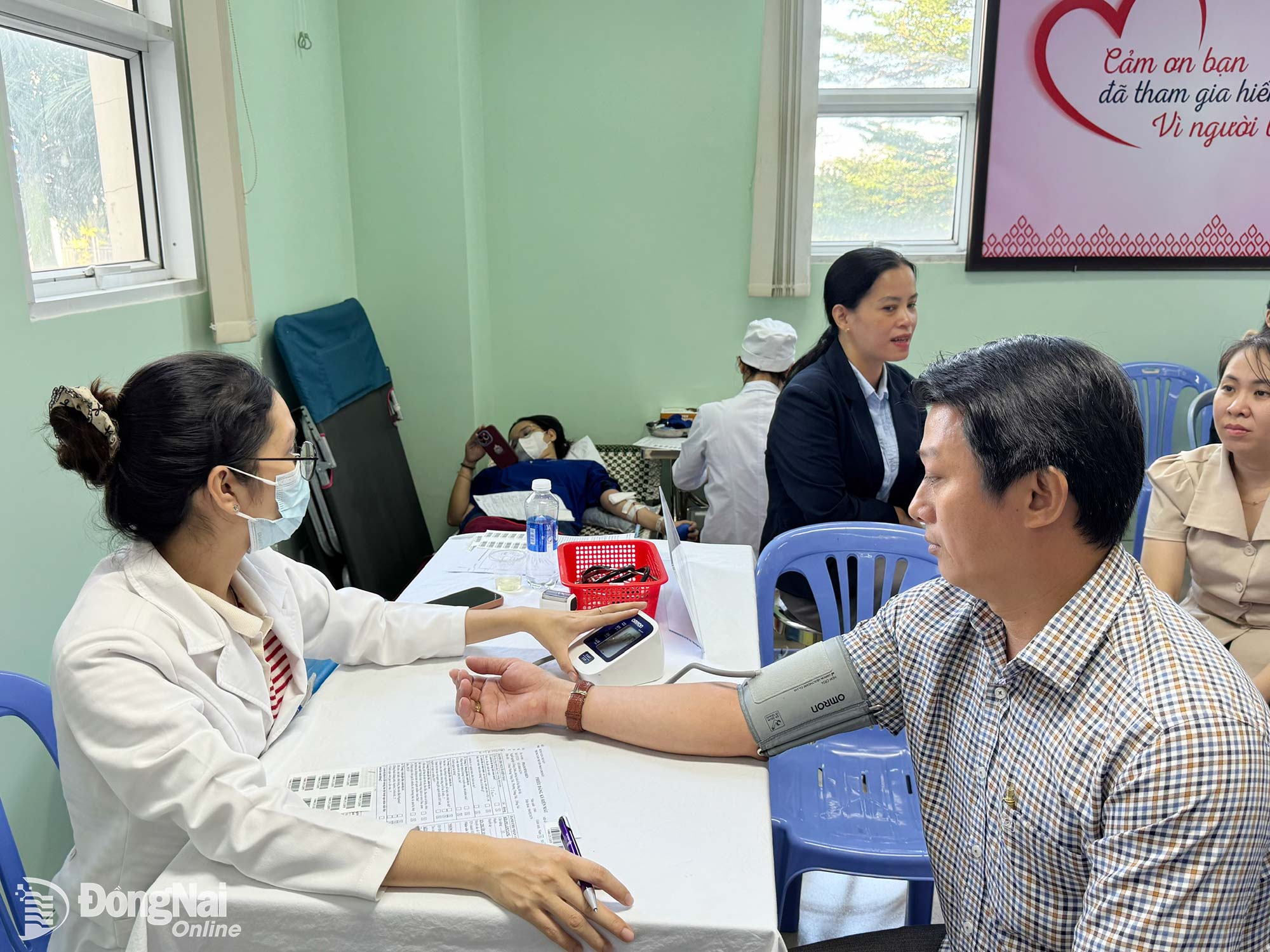| 医療スタッフが献血前にボランティアの血圧を測定する。写真:ハン・ドゥン |
