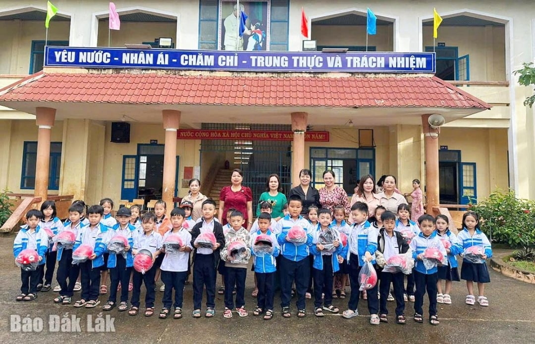 クロン・ブク小学校(エア・クリ村)の生徒たちは、2025~2026年度の初めにヘルメットを受け取ります。 |