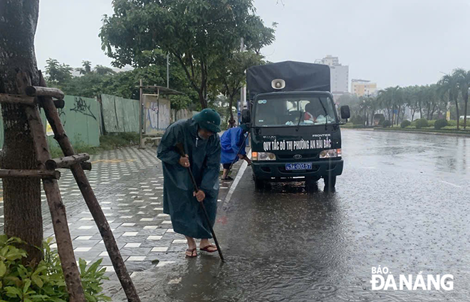 | アンハイバック地区の緊急対応チームのメンバーが、洪水を防ぐために排水溝の清掃作業を行っている。写真:ティエン・ドゥン |