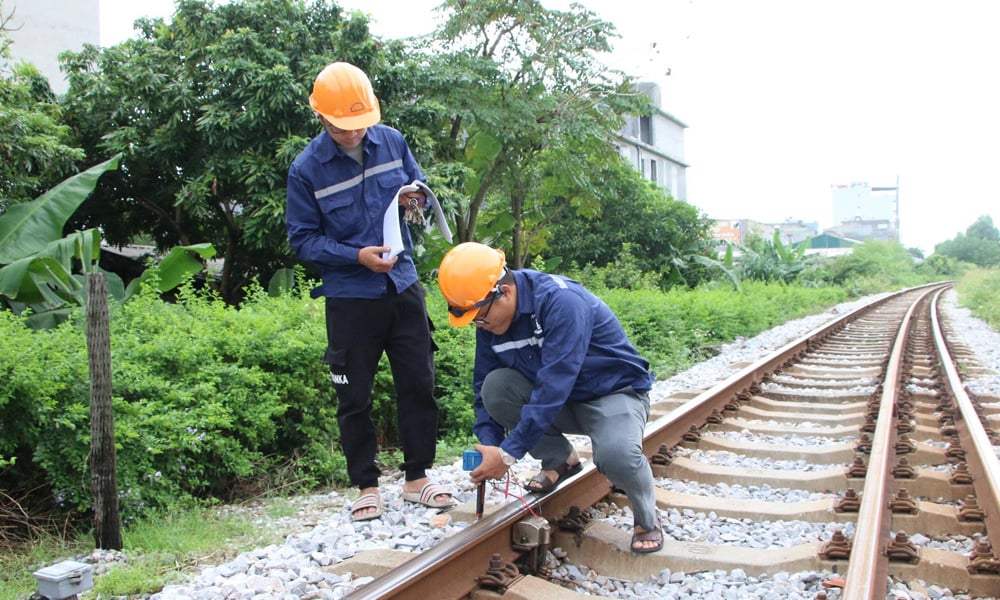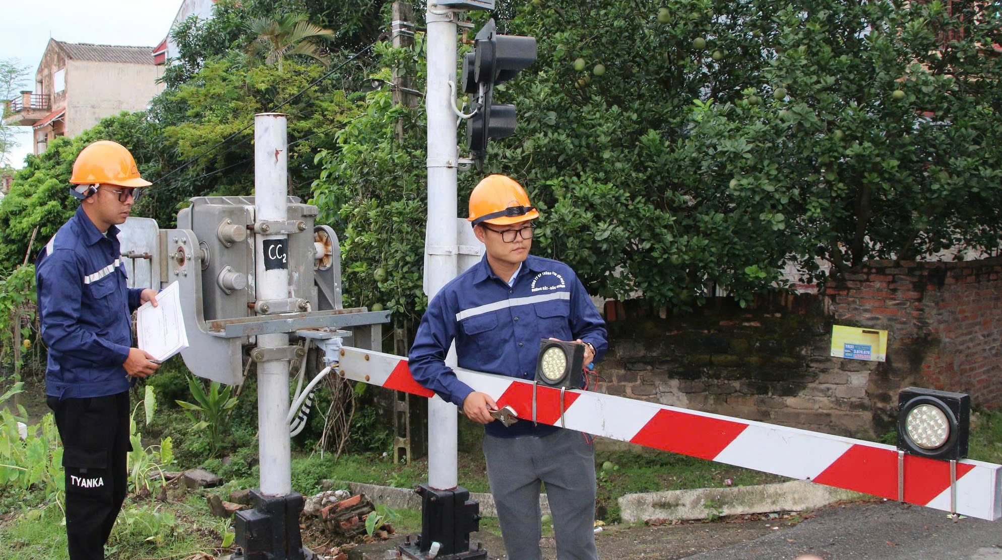 バクザン鉄道信号情報供給線の作業員が、ダマイ地区を通る48+120キロ地点で修理後の遮断機モーターを確認している。写真:マイ・トアン |