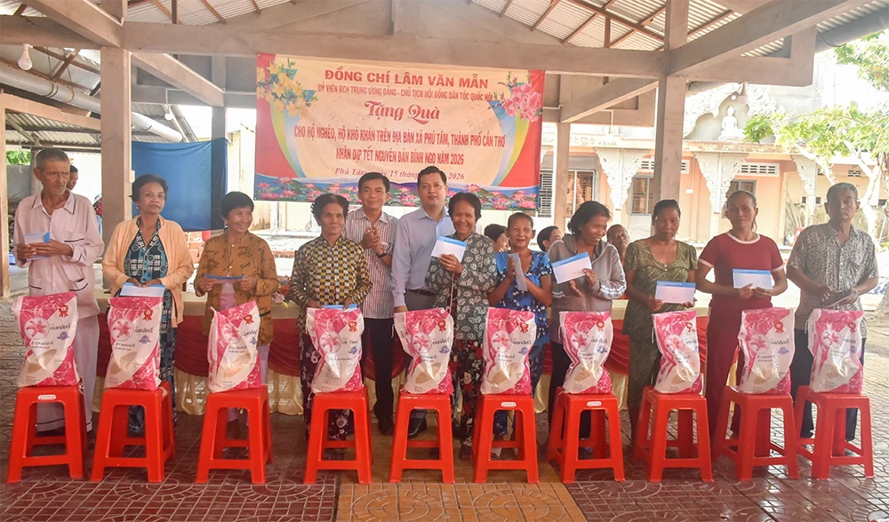 2月15日午前、 カントー市少数民族宗教局は、フータム村党委員会と連携し、ベトナム共産党中央委員、国会常任委員、国会民族評議会議長であるラム・ヴァン・マン氏からの贈り物を、2026年旧正月(午年)に際し、同村の貧困世帯や困難な状況にある世帯に配布した。