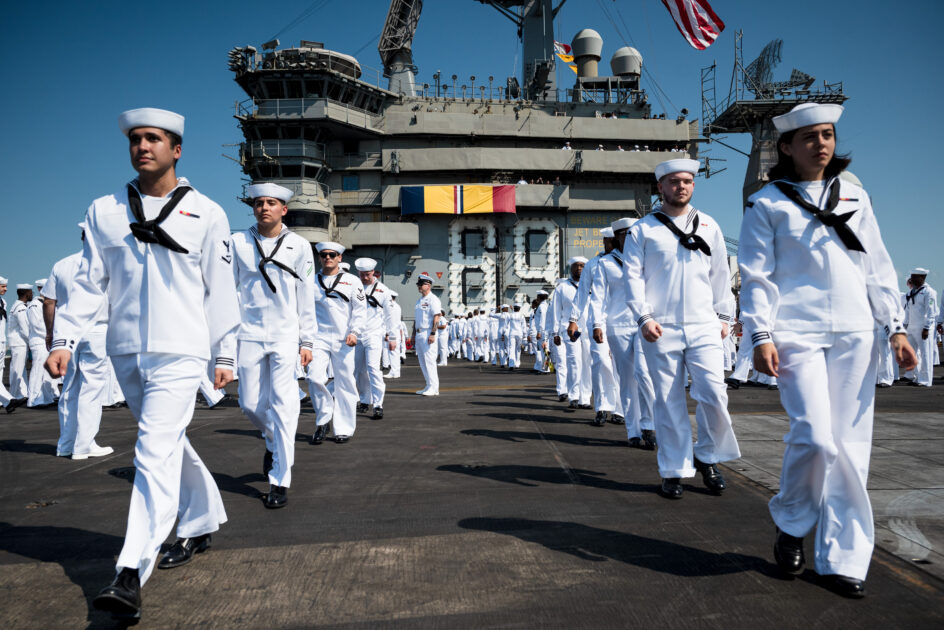 2024年7月14日、米海軍空母ドワイト・D・アイゼンハワー(CVN-69)の乗組員がバージニア州ノーフォーク海軍基地に帰還する。写真:USNI News