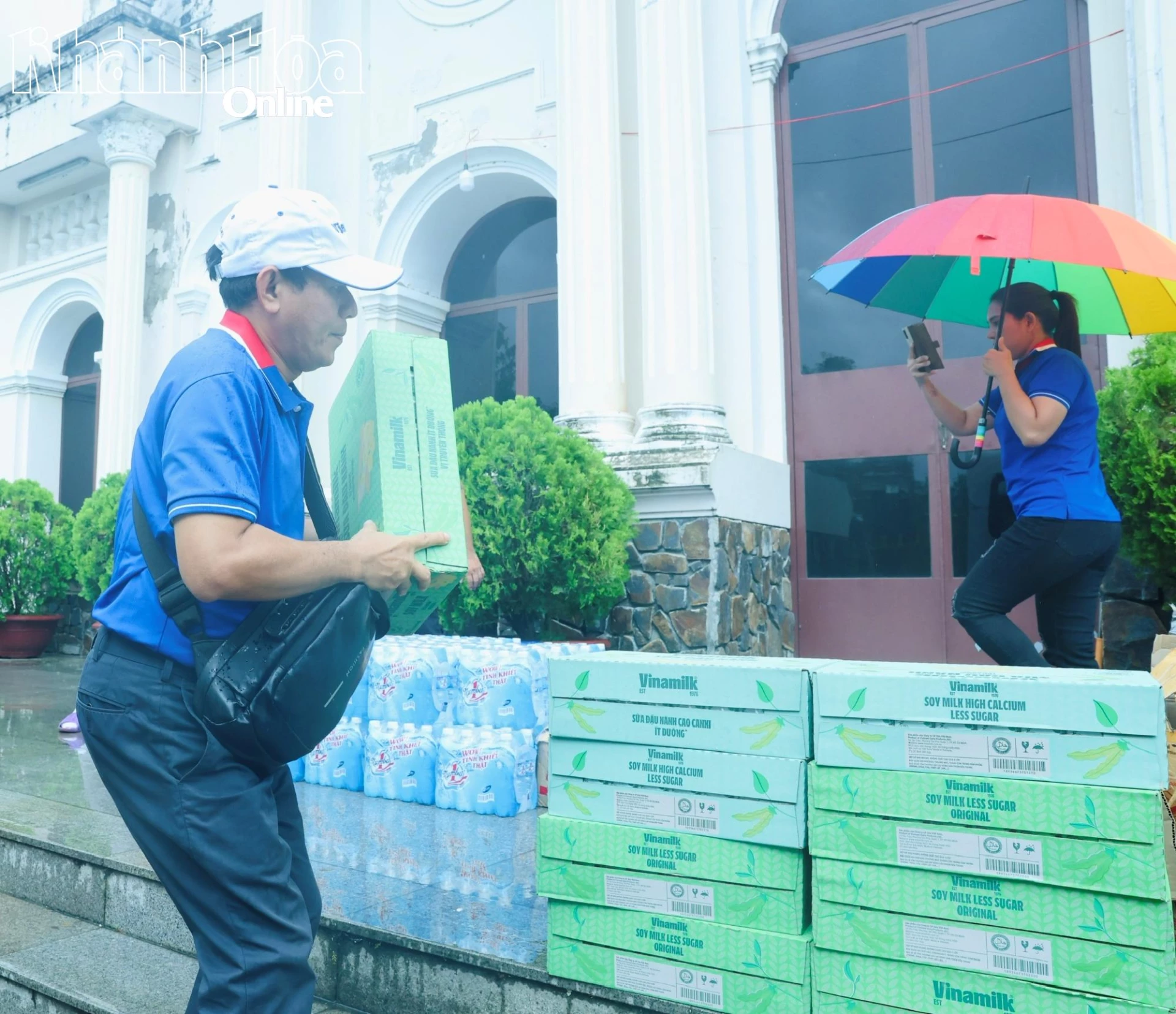 | ディエンディエン村タイ3村の人々に配るために、カイヴォン教会の前にビナミルクの牛乳パックが集められました。 |