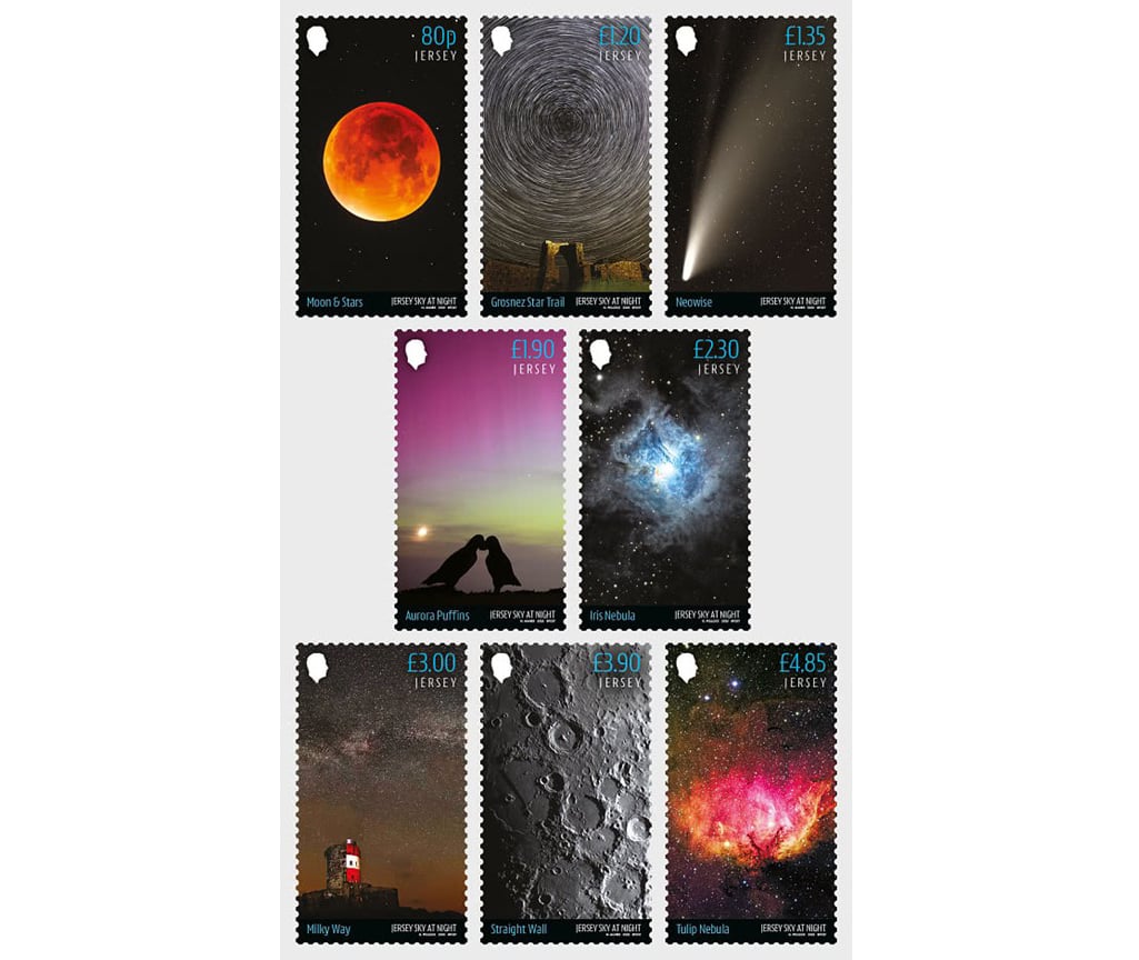 3 trong số 8 con tem có hình ảnh các địa danh mang tính biểu tượng của Jersey gồm Lâu đài Grosnez, Chim Hải âu cánh cụt và Tháp Archirondel. Năm bức ảnh còn lại là những bức ảnh không gian tuyệt đẹp, tập trung vào một hiện tượng thiên văn cụ thể, như hiện tượng nguyệt thực.