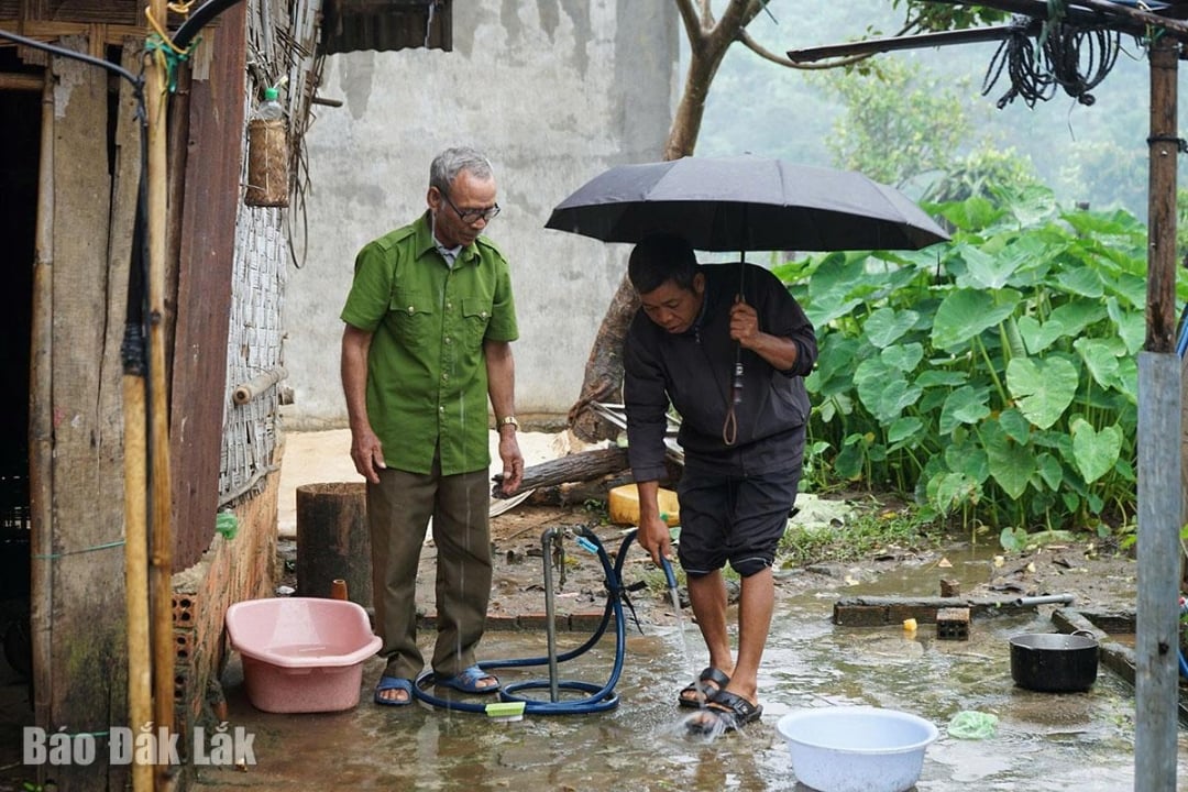 | Ông Y Par Đăk Căt (ngoài cùng bên trái) vận động người dân trong buôn sử dụng nguồn nước sạch từ công trình cấp nước tập trung. |