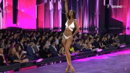 Top 20 Miss Grand International 2024 bước vào phần thi áo tắm với trang phục hai mảnh màu trắng. Trên nền nhạc sôi động, từng thí sinh bước ra trong sự cổ vũ nồng nhiệt từ khán giả.