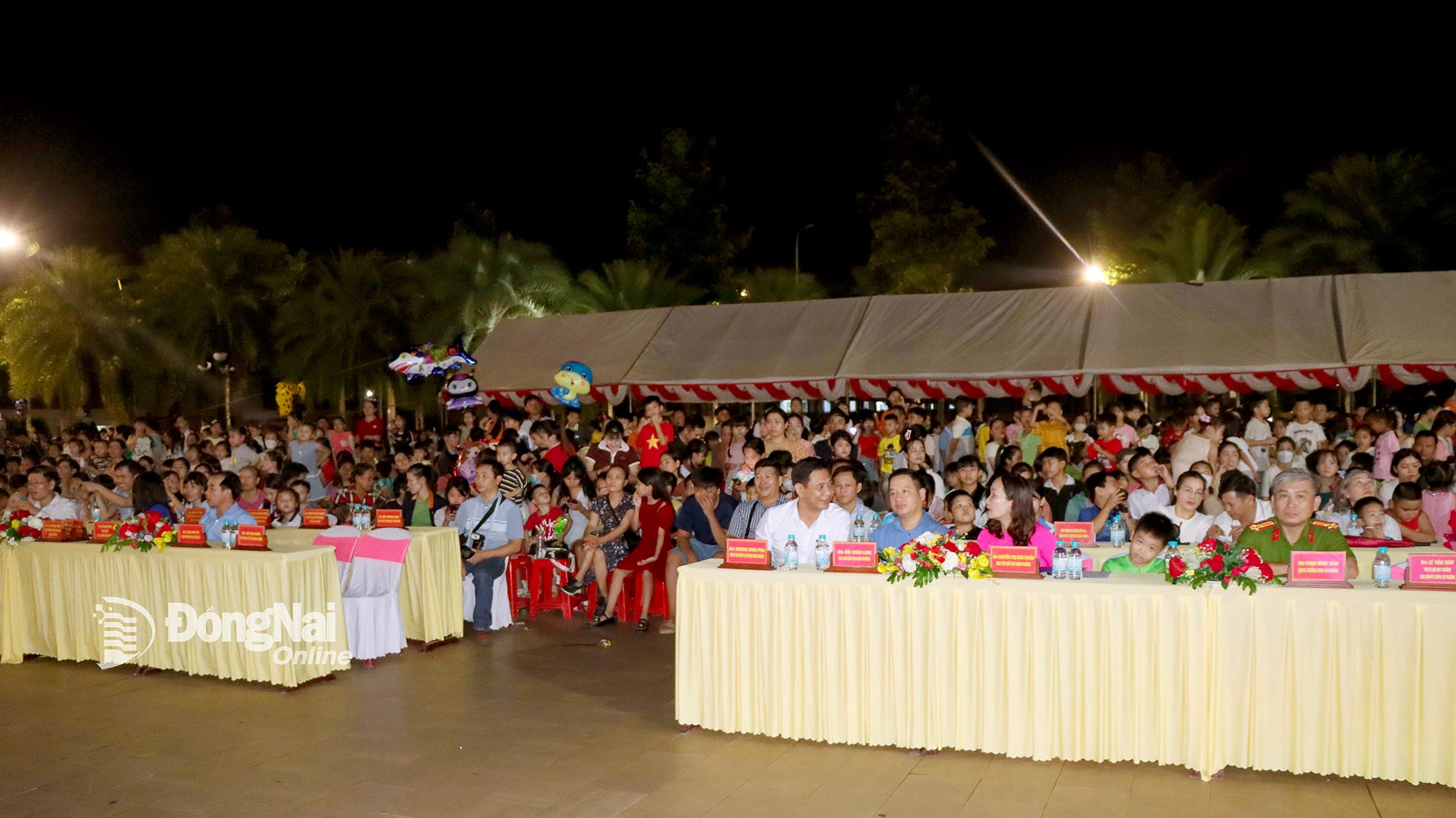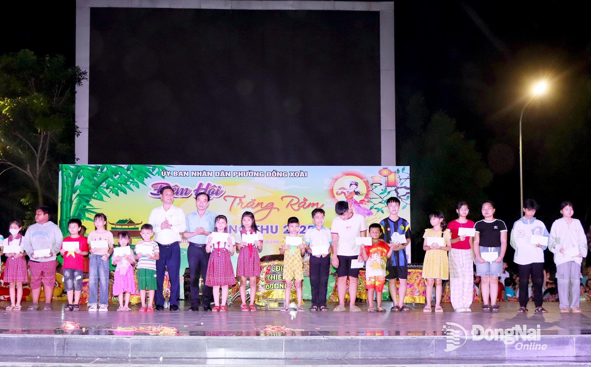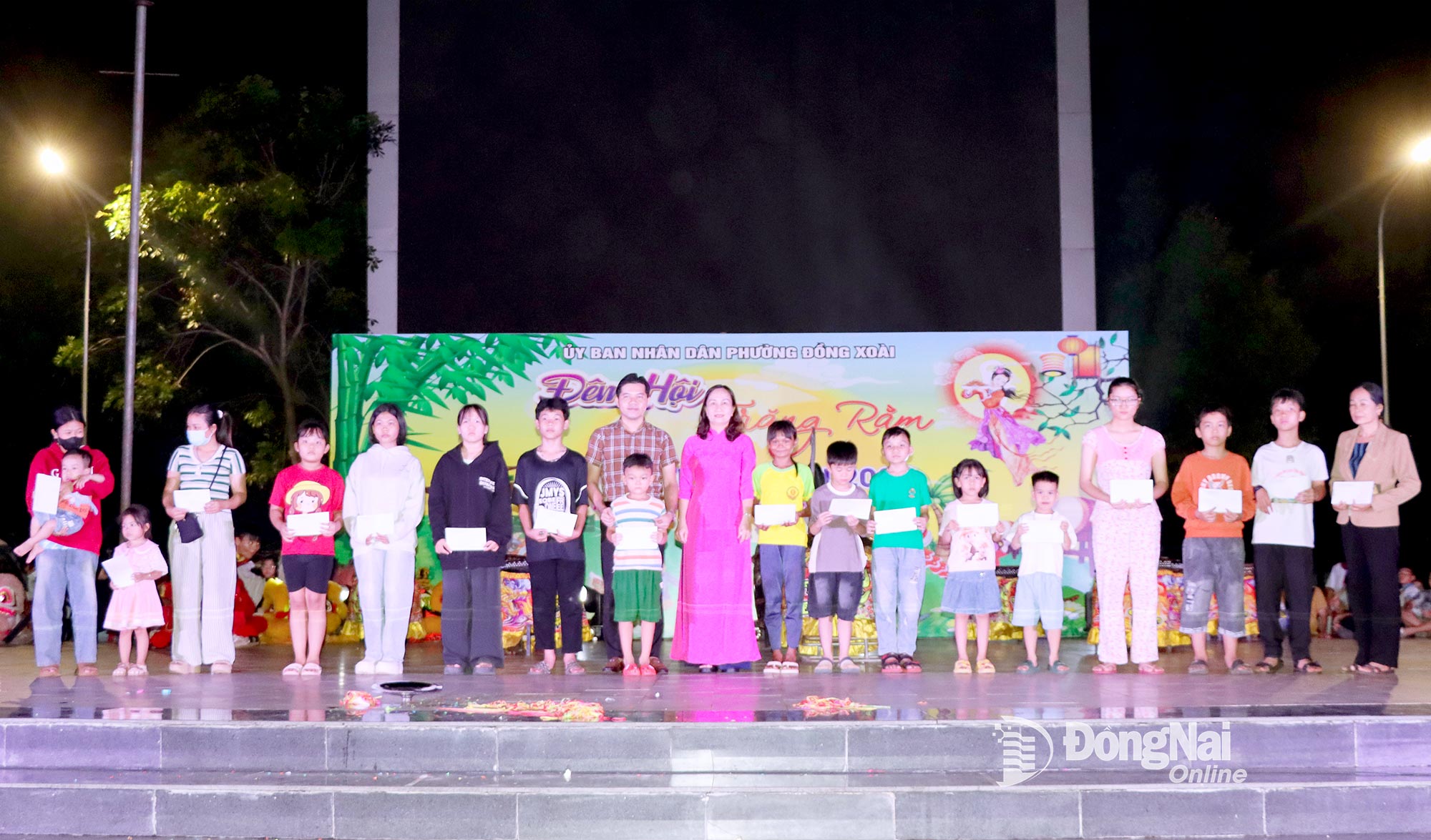 ថ្នាក់ដឹកនាំវួដ Dong Xoai កុមារ និងប្រជាជនក្នុងតំបន់ចូលរួមពិធីបុណ្យព្រះច័ន្ទពេញវង់។ រូបថត៖ ថាញ់ ម៉ាង |