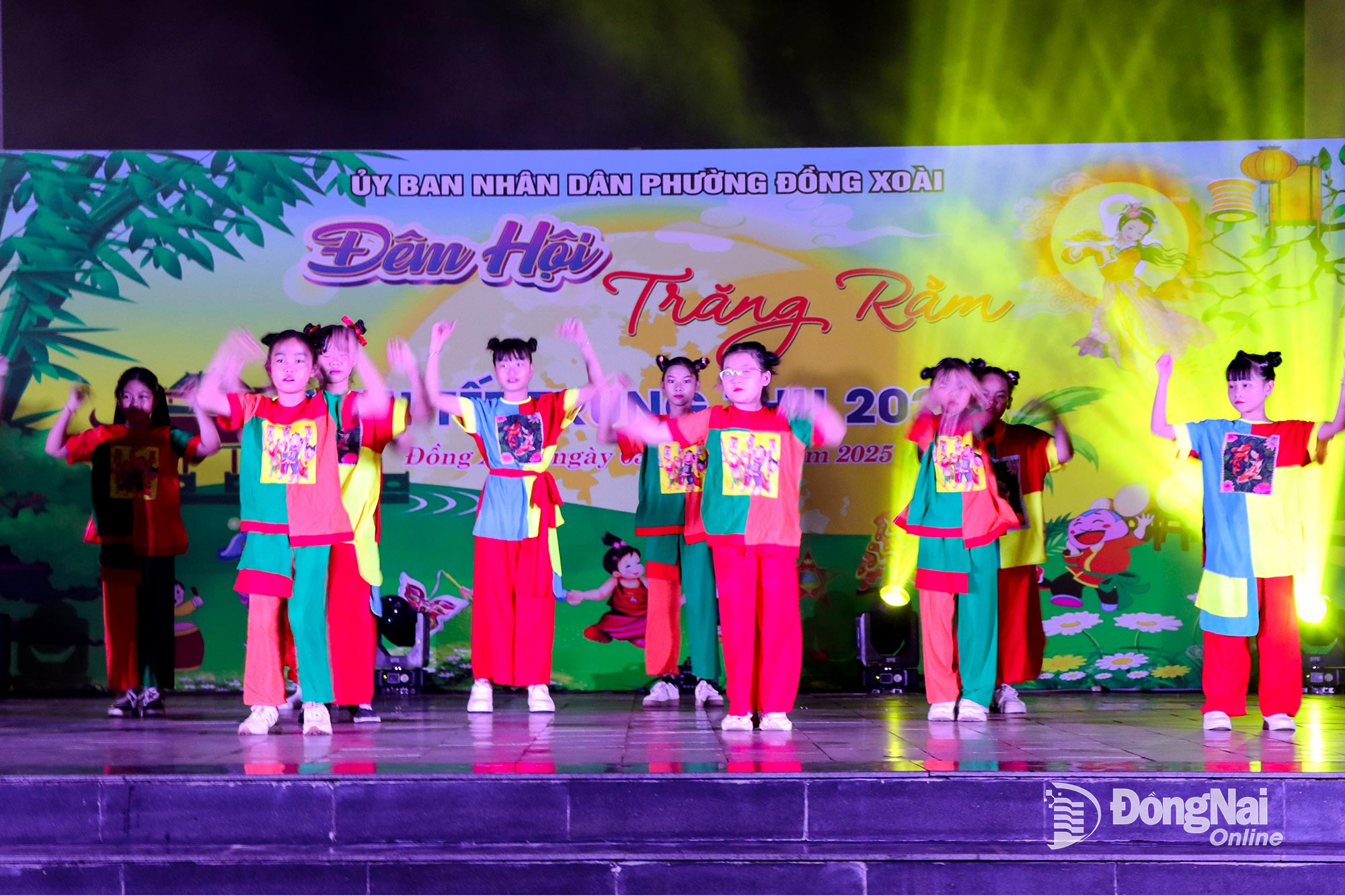 មហោស្រពពាក់កណ្តាលសរទរដូវឆ្នាំនេះនៅ Dong Xoai Ward ត្រូវបានប្រារព្ធឡើងក្រោមប្រធានបទ “Happy Mid-Autumn Festival 2025” ដោយមានការសម្តែងប្លែកៗជាច្រើនដោយកុមារក្នុងវួដ។ ការរាំតោដ៏រស់រវើក គោមចម្រុះពណ៌ និងម្ហូបប្រពៃណីក្នុងពិធីបុណ្យពាក់កណ្តាលរដូវស្លឹកឈើជ្រុះ បានបង្កើតបរិយាកាសដ៏កក់ក្តៅ បង្កប់ដោយអត្តសញ្ញាណជាតិ។