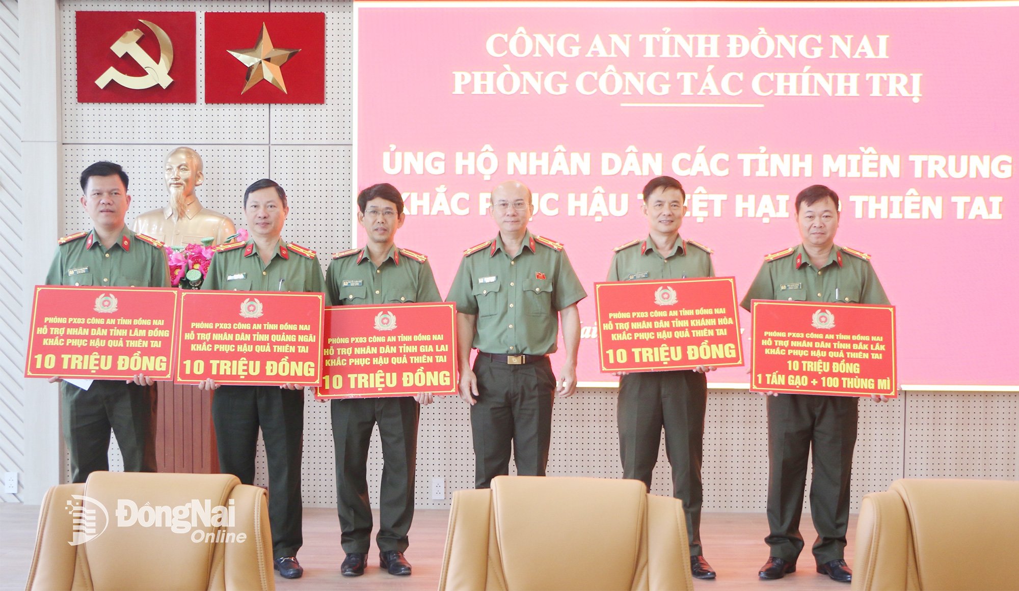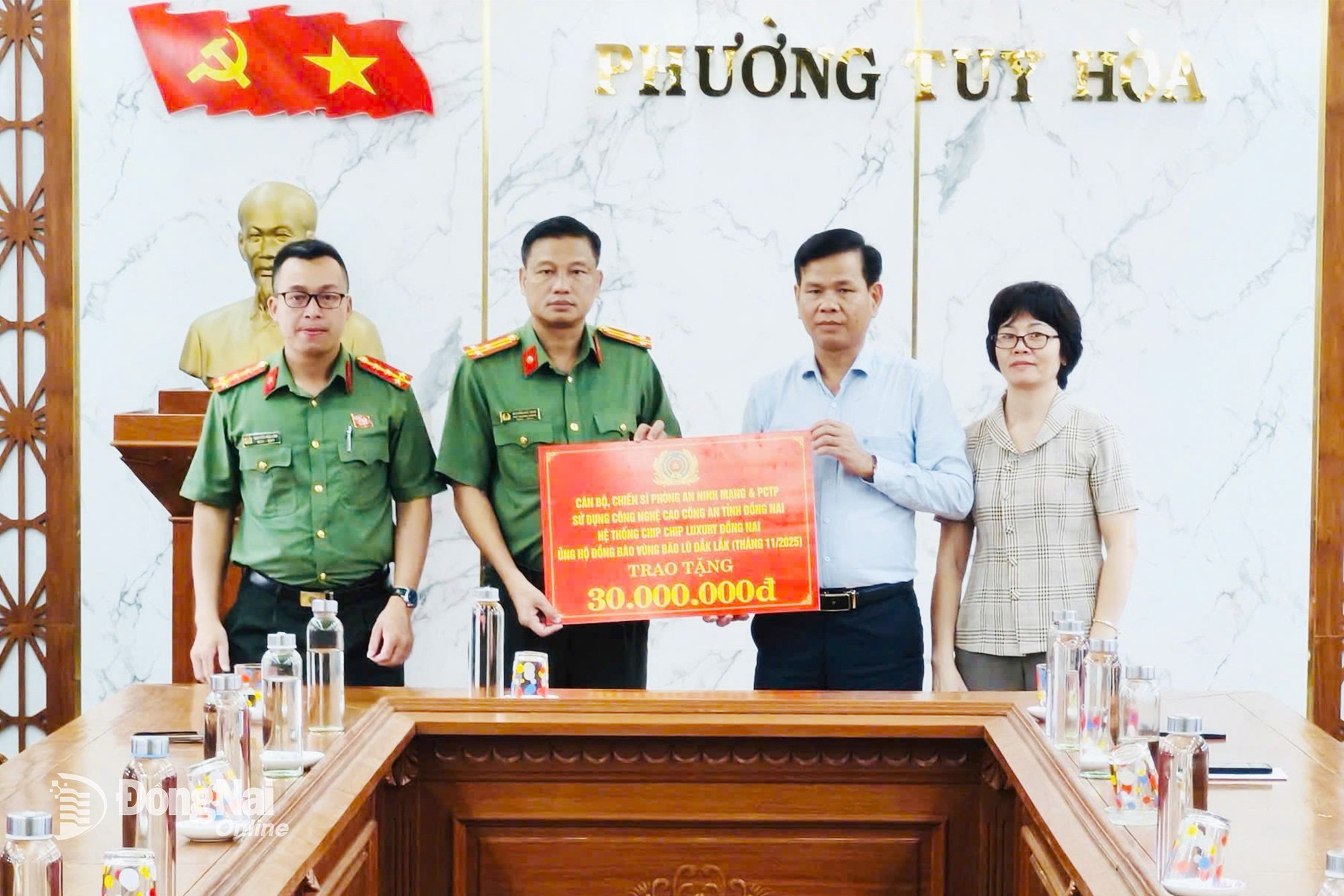 កន្លងមក ក្នុងដំណើរបំពេញទស្សនកិច្ចការងារជួយប្រជាជនខេត្ត Dak Lak ថ្នាក់ដឹកនាំនាយកដ្ឋាន ការពារសន្តិសុខតាមប្រព័ន្ធអ៊ីនធឺណែត និងបច្ចេកវិជ្ជាខ្ពស់ នៃស្នងការដ្ឋាននគរបាលខេត្ត Dong Nai ក៏បានប្រគល់ថវិកាចំនួន ៣០លានដុង ជូនប្រជាពលរដ្ឋនៅសង្កាត់ Tuy Hoa ខេត្ត Dak Lak ដើម្បីជួយប្រជាជនជំនះការលំបាក។ នេះជាទឹកចិត្តរបស់មន្ត្រីនគរបាល និងទាហាននៃអង្គភាពខេត្ត Dong Nai ឆ្ពោះទៅរកប្រជាជននៅតំបន់ទឹកជំនន់។
