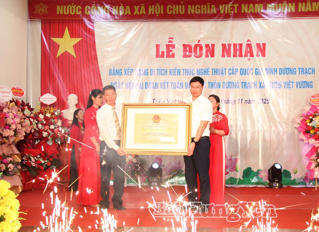 ភូមិ Duong Trach ឃុំ Trieu Viet Vuong បានរៀបចំពិធីទទួលវិញ្ញាបនបត្រចំណាត់ថ្នាក់ស្ថាបត្យកម្ម និងសិល្បៈជាតិសម្រាប់ផ្ទះសហគមន៍ Duong Trach និងពិធីបុណ្យបង្រួបបង្រួមជាតិ ដើម្បីអបអរសាទរខួបលើកទី 95 នៃទិវាប្រពៃណីរណសិរ្សមាតុភូមិវៀតណាម (ថ្ងៃទី 18 ខែវិច្ឆិកា ឆ្នាំ 1930 ដល់ថ្ងៃទី 25 ខែវិច្ឆិកា)។