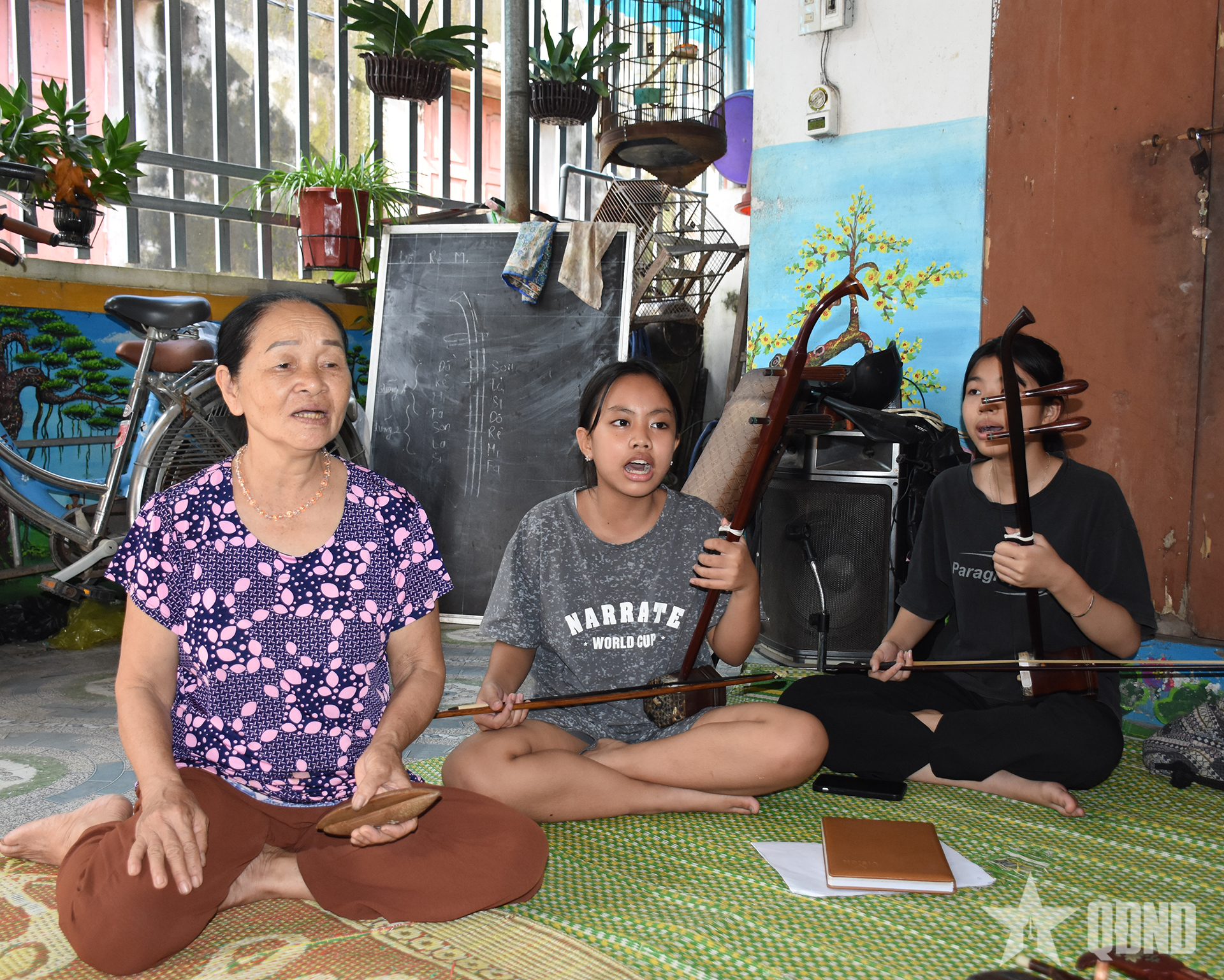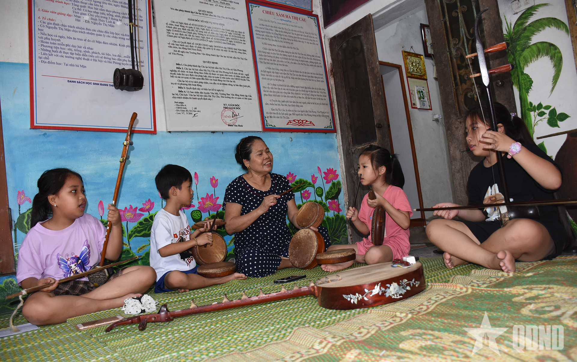 លោកស្រី Nguyen Thi Man (កូនស្រីរបស់ Ha Thi Cau) ប្រធានក្លឹបចម្រៀង Ha Thi Cau Xam បង្រៀន Xam Singing ដល់ក្មេងៗ។ |