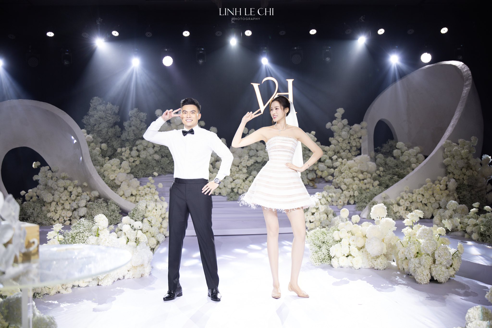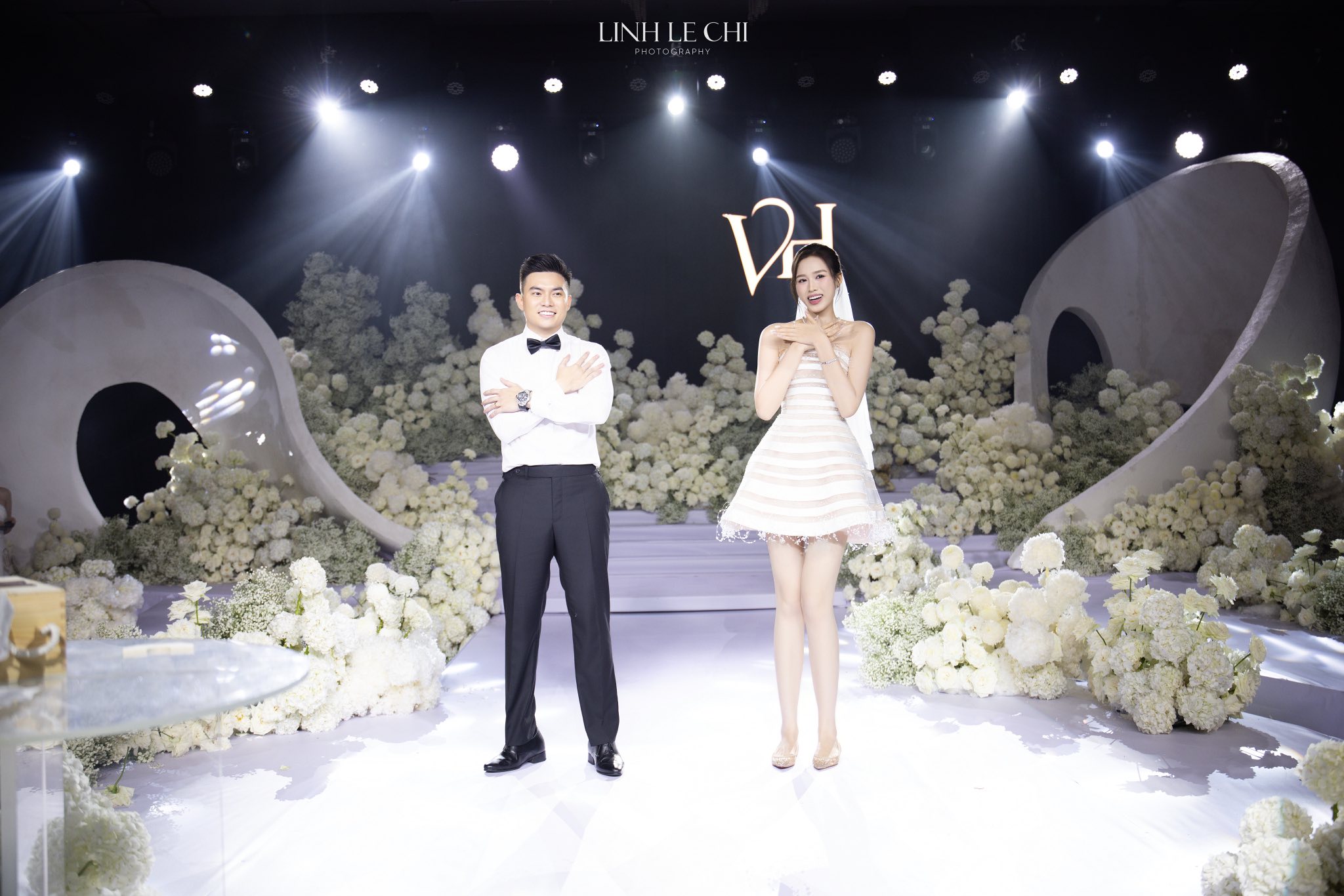 Do My Linh ក៏​ជ្រើសរើស​ស្បែកជើង​សំប៉ែត​ដើម្បី​ឈរ​ជាមួយ​ស្វាមី​ដើម្បី​រក្សា​តុល្យភាព​ក្នុង​ពិធី​មង្គលការ​។
