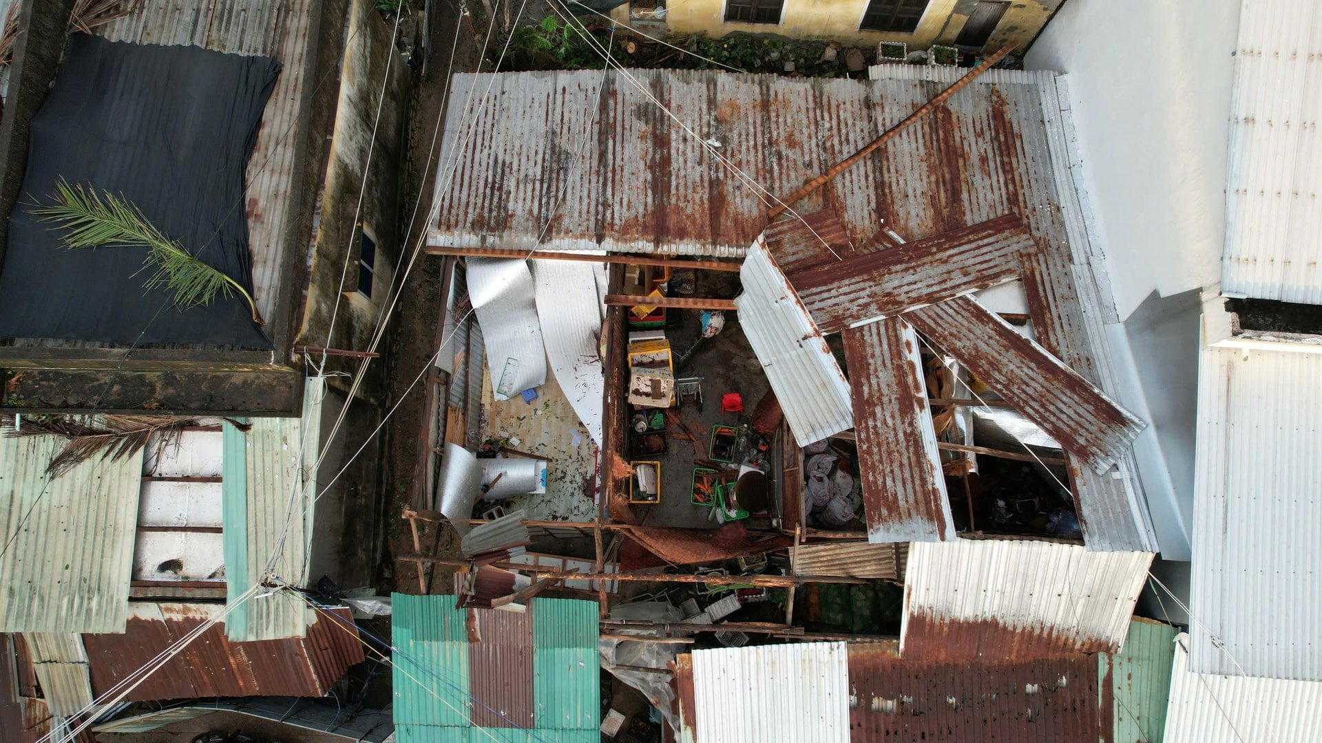ដំបូលដែកត្រូវខ្យល់បក់បោកខ្ទប់ផ្លូវលំនៅក្បែរផ្សារ។