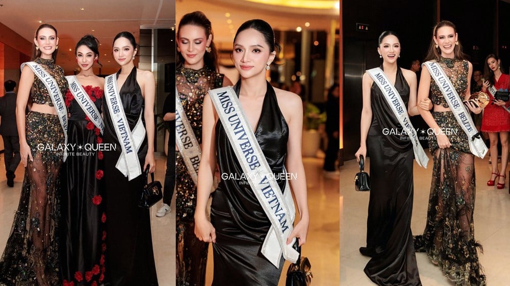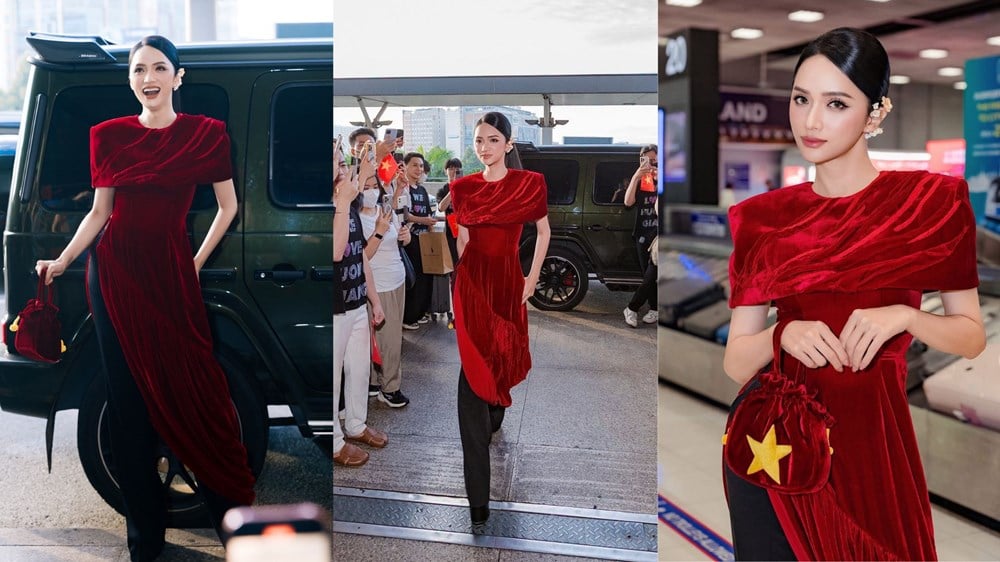 នៅឯអាកាសយានដ្ឋាន ម្ចាស់ក្សត្រីបានជ្រើសរើសអាវវល្លិ៍ក្រហមដ៏ប្រណិតបែបបុរាណ បង្ហាញរូបភាពវៀតណាមយ៉ាងស្អាត និងប្លែក។ ពេលទៅដល់ប្រទេសថៃ Huong Giang បានផ្លាស់ប្តូរទៅជាសម្លៀកបំពាក់ពណ៌ស ជាមួយនឹងការតុបតែងខ្លួនបែបស្រាលៗ ស្របតាមស្ទីលក្នុងស្រុក បង្កើតបានជារូបរាងដ៏ប្រណិត និងទាក់ទាញ។