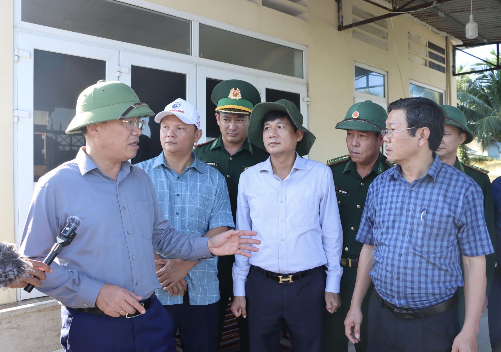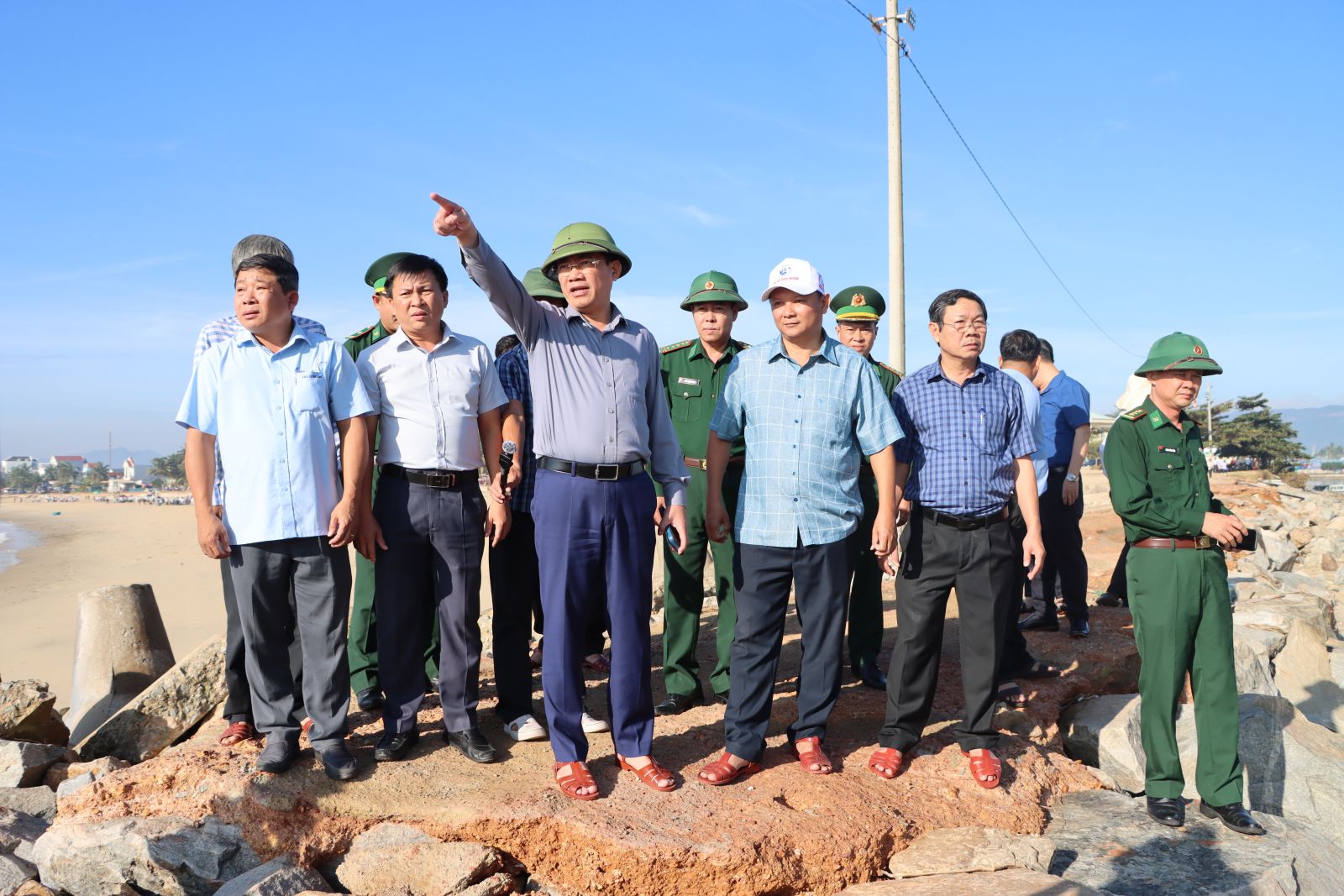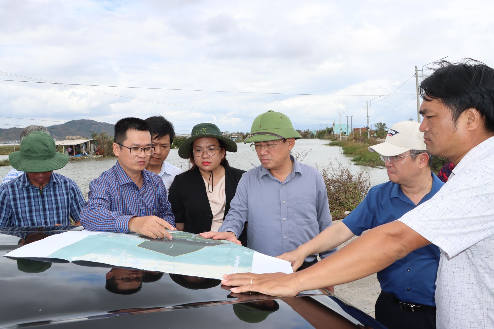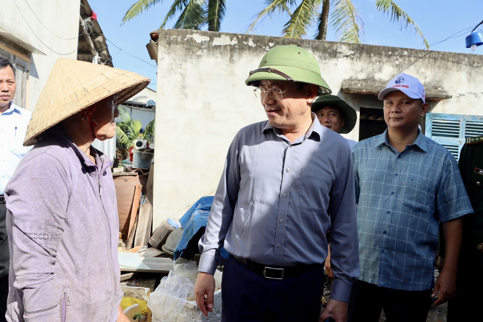 នៅមាត់ទន្លេ An Du (វួដ Hoai Nhon) ប្រធាន Pham Anh Tuan បានសរសើររដ្ឋាភិបាលក្នុងតំបន់ដែលបានជម្លៀសប្រជាជនយ៉ាងសកម្ម និងទាន់ពេលវេលា ទប់ស្កាត់ការបាត់បង់អាយុជីវិត។ លោកបានស្នើដល់មូលដ្ឋានពិនិត្យមើលតំបន់តាំងទីលំនៅថ្មី រៀបចំកន្លែងស្នាក់នៅឲ្យមានស្ថិរភាព និងគាំទ្រដល់ការផ្លាស់ប្តូរអាជីពសម្រាប់ប្រជាពលរដ្ឋដែលរងផលប៉ះពាល់។ ទន្ទឹមនឹងនេះ ត្រូវសម្អាតបរិស្ថានជាបន្ទាន់ និងជួសជុលសាលារៀន ដើម្បីឲ្យសិស្សបានចូលរៀនវិញឆាប់។ ប្រធានគណៈកម្មាធិការប្រជាជនខេត្តក៏បានកត់សម្គាល់ផងដែរអំពីសំណឹក និងការបាក់ដីដ៏ធ្ងន់ធ្ងរនៅមាត់ទន្លេ An Du ដែលទាមទារឱ្យមានដំណោះស្រាយទាន់ពេលវេលា។