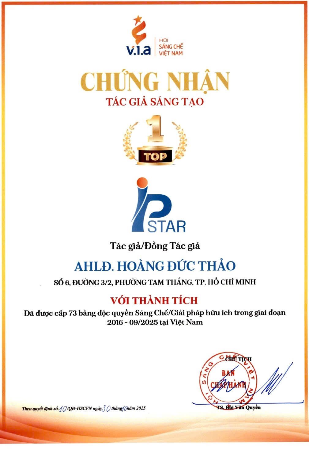 សមាគមប្រឌិតវៀតណាមក៏បានប្រគល់វិញ្ញាបនបត្រអ្នកប្រឌិតដល់សាស្រ្តាចារ្យកិត្តិយស វេជ្ជបណ្ឌិត និងអ្នកសិក្សា វីរៈបុរសការងារ Hoang Duc Thao សម្រាប់ស្នាដៃរបស់គាត់ក្នុងការទទួលបានប៉ាតង់ផ្តាច់មុខចំនួន 73 សម្រាប់ដំណោះស្រាយច្នៃប្រឌិត/ឧបករណ៍ប្រើប្រាស់ក្នុងកំឡុងឆ្នាំ 2016 - ខែតុលា ឆ្នាំ 2025 នៅវៀតណាម។