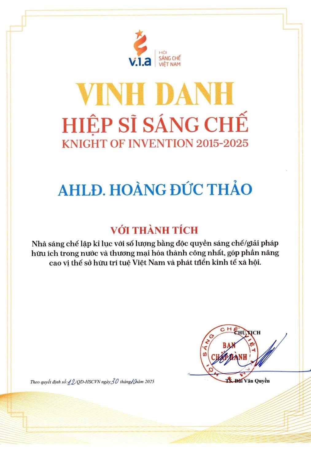 ចំណងជើង “Knight of Invention 2015-2025” ផ្តល់កិត្តិយសដល់សាស្រ្តាចារ្យ វេជ្ជបណ្ឌិត វេជ្ជបណ្ឌិតកិត្តិយស វីរៈបុរសការងារ Hoang Duc Thao ដែលជាអ្នកបង្កើតកំណត់ត្រាសម្រាប់ចំនួនប៉ាតង់/ដំណោះស្រាយឧបករណ៍ប្រើប្រាស់ក្នុងស្រុកច្រើនបំផុត និងការធ្វើពាណិជ្ជកម្មប្រកបដោយជោគជ័យ រួមចំណែកលើកកំពស់ឋានៈកម្មសិទ្ធិបញ្ញា និងការអភិវឌ្ឍន៍ សេដ្ឋកិច្ចសង្គម របស់វៀតណាម។