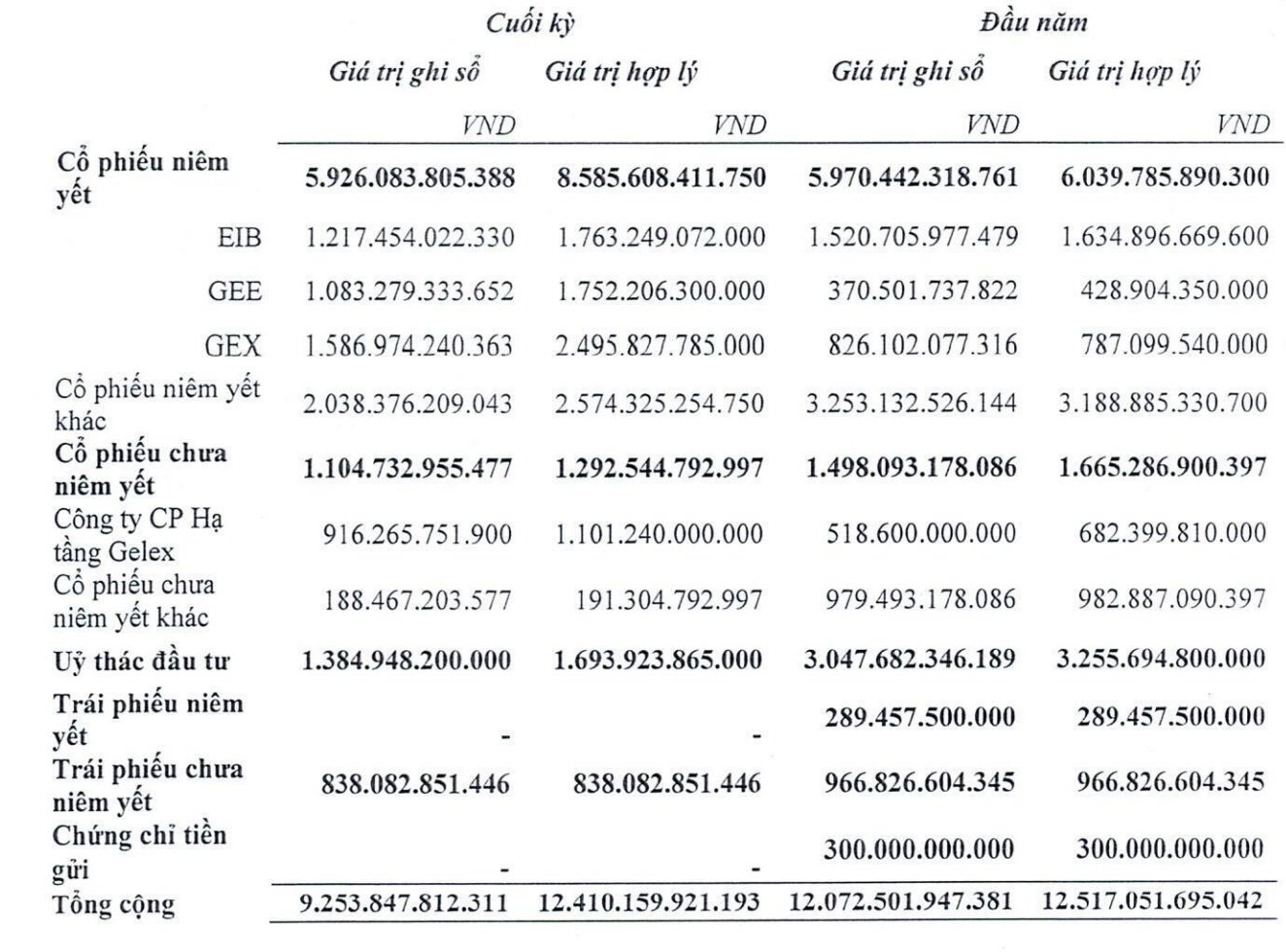 តម្លៃនៃការវិនិយោគនៅក្នុងកូដទាំងបី EIB - GEE - GEX តែមួយមានច្រើនជាង 6,000 ពាន់លានដុង ដែលស្មើនឹង 70% នៃផលប័ត្រភាគហ៊ុនដែលបានចុះបញ្ជី។ លើសពីនេះ VIX ក៏បានវិនិយោគចំនួន 1,292 ពាន់លានដុងនៅក្នុងភាគហ៊ុនដែលមិនបានចុះបញ្ជី ដែលក្នុងនោះ 1,101 ពាន់លានដុងជាភាគហ៊ុនរបស់ ក្រុមហ៊ុន Gelex Infrastructure JSC ។
