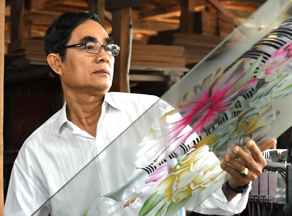 អតីតយុទ្ធជន Nguyen Thanh Hoa ត្រួតពិនិត្យផលិតផលគំនូរកញ្ចក់ដែលបោះពុម្ពដោយប្រើប្រាស់បច្ចេកវិទ្យាបោះពុម្ព 3D។ |