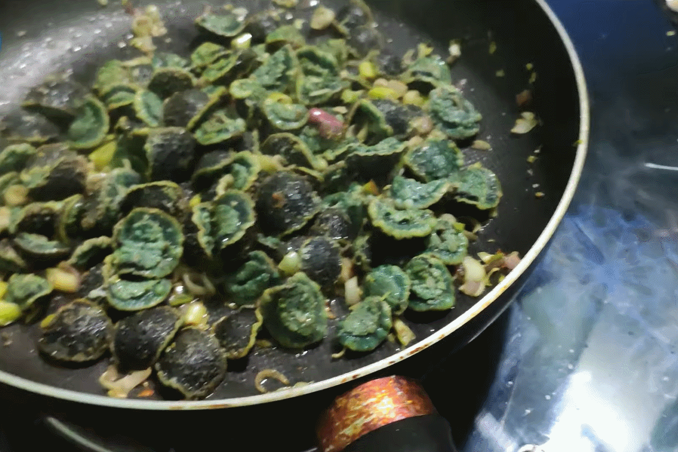នៅពេលដែលក្លិនចេញមក បន្ថែមឈាម ដាំឱ្យពុះពីរបីនាទី បន្ទាប់មកបន្ថែមទឹក។ ពេលទឹកពុះដាក់ស្លឹកខ្ទឹមដែលលាងទឹករួចដាំឱ្យពុះ៣-៥នាទីបិទភ្លើងដាក់ចូលចានឆាឱ្យក្តៅ ។