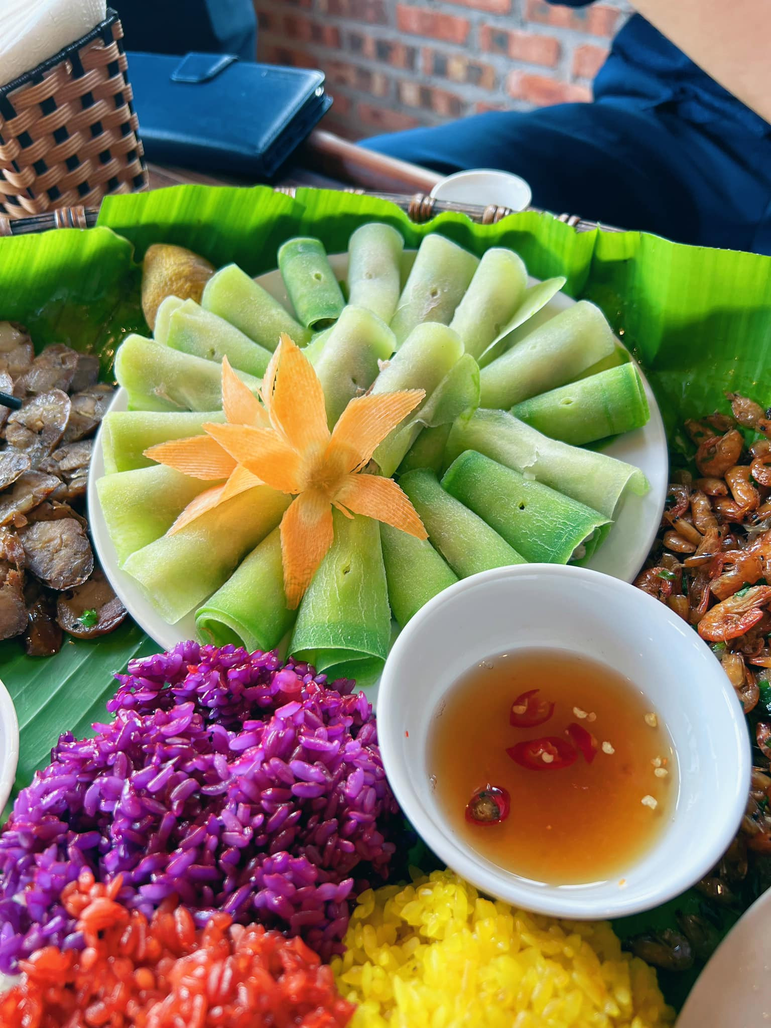 អាហារដែលបម្រើជូនភ្ញៀវនៅទីនេះច្រើនតែរួមមាន សាច់ជ្រូកអាំង បាយដំណើបជាមួយប្រហិតចិន សាច់ជ្រូកបំពង ត្រីស្បៃកាចៀន បង្គាបំពងជាមួយស្លឹកគ្រៃ... និងចានដែលផលិតពីប្រហិតបៃតងពិសេស។