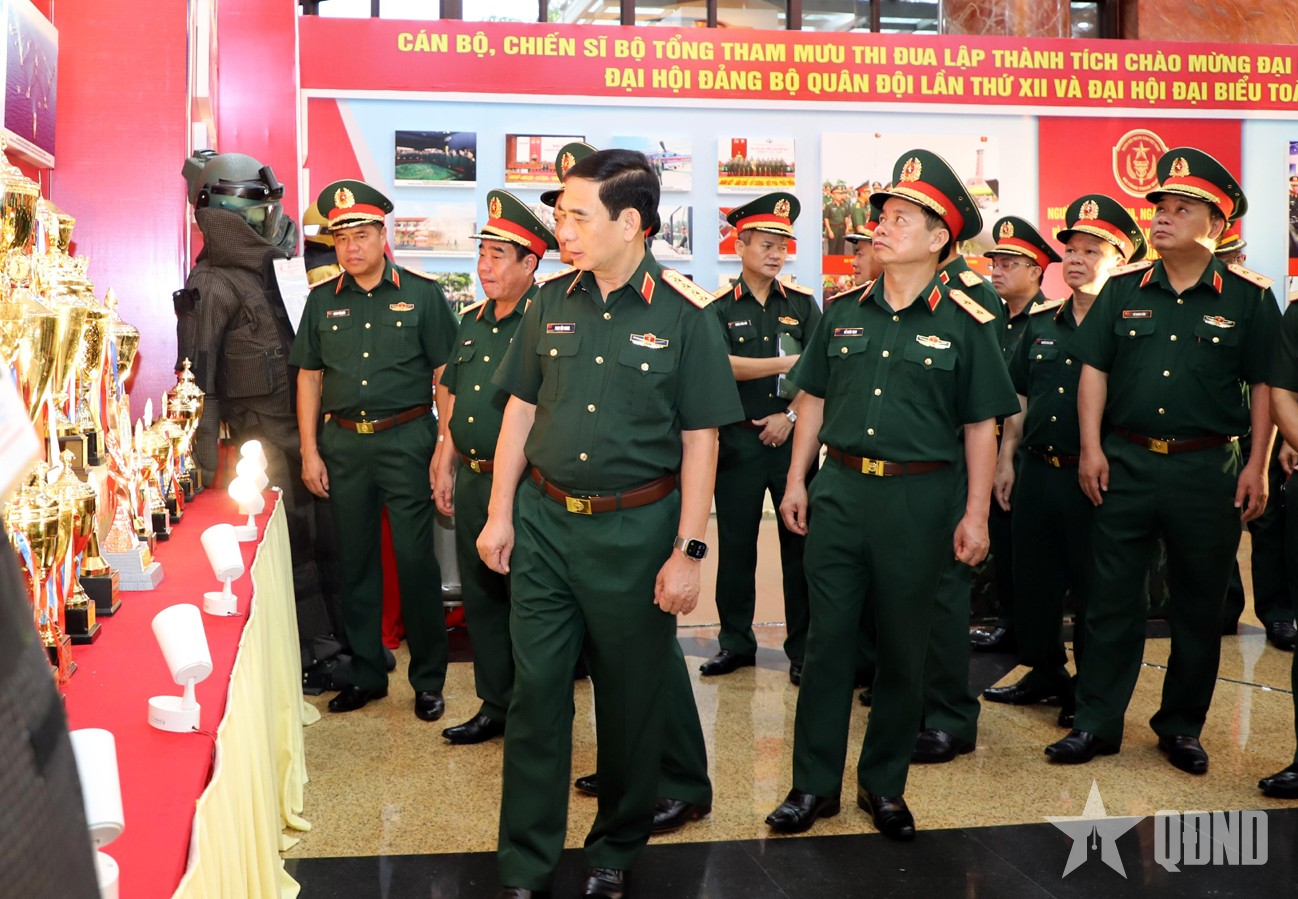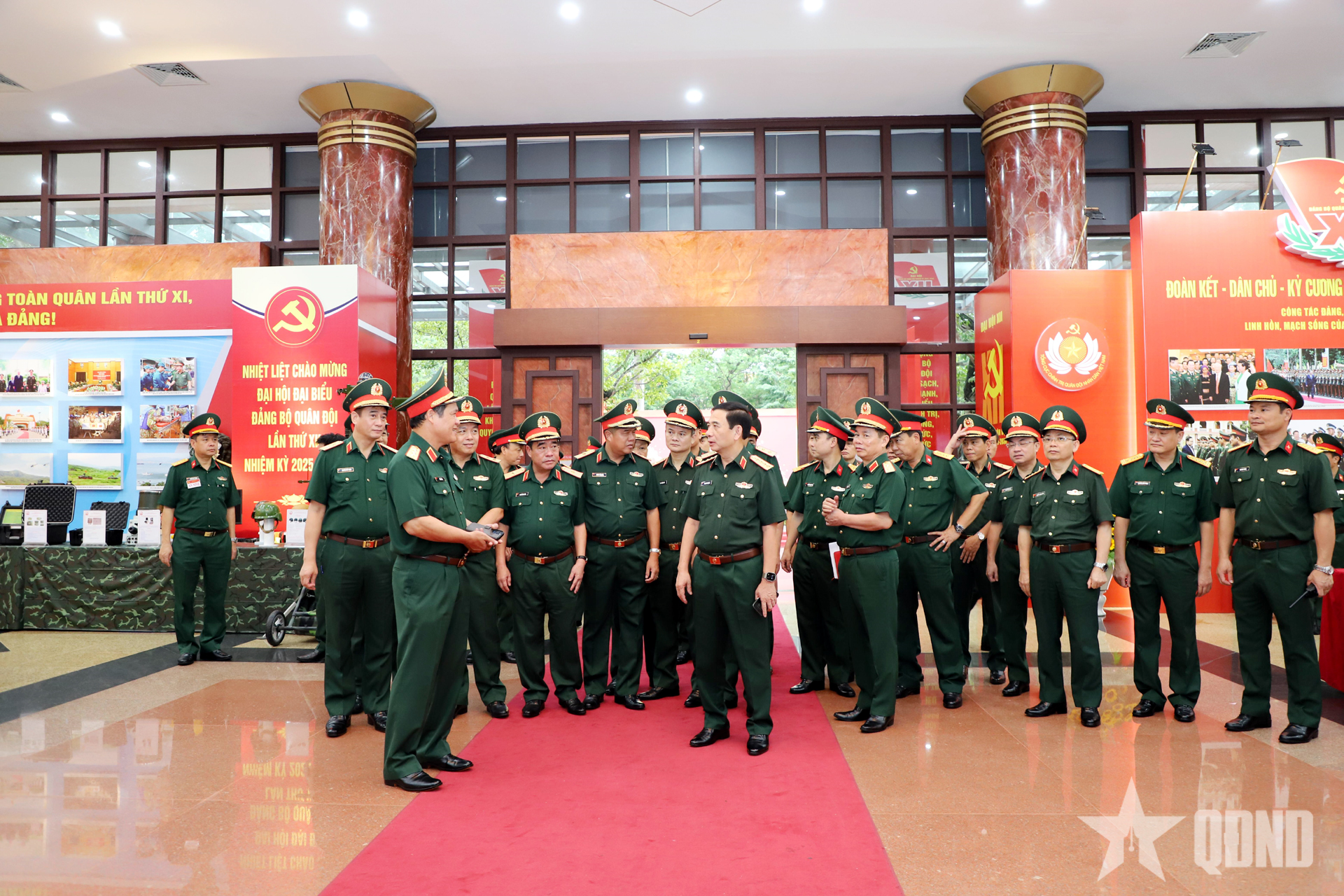 នាយឧត្តមសេនីយ៍ Phan Van Giang បានអញ្ជើញត្រួតពិនិត្យការតាំងបង្ហាញផលិតផលរបស់បក្ស និងសកម្មភាព នយោបាយ ។ |