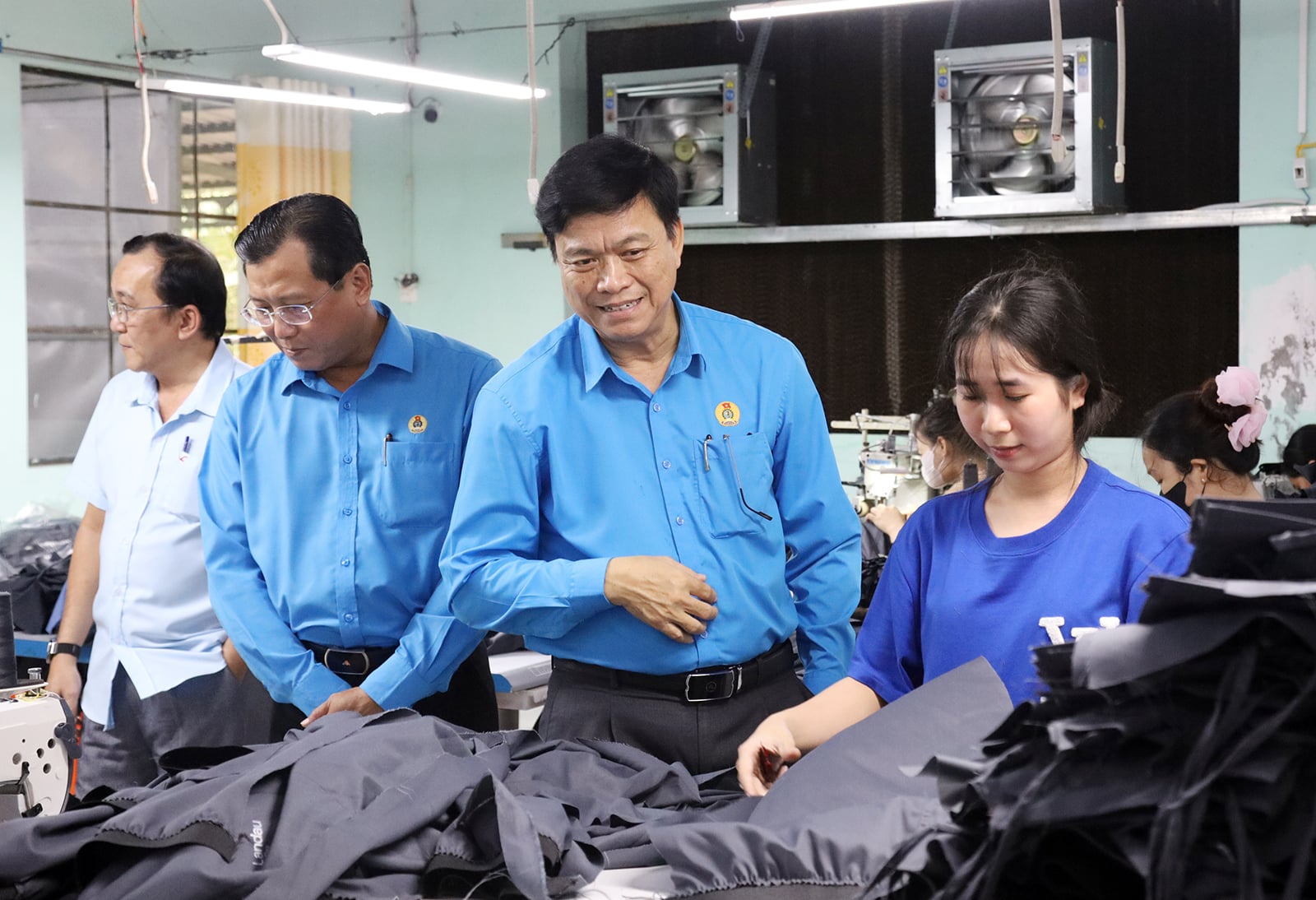 សមមិត្ត Do Tran Thinh (ទី 2 ពីស្តាំ) - ប្រធានសហព័ន្ធការងារខេត្តបានទៅសួរសុខទុក្ខសមាជិកសហជីពនៃសាខា Cho Moi នៃក្រុមហ៊ុន Lai Vung Garment Company Limited ។ រូបថត៖ BICH TUYEN
