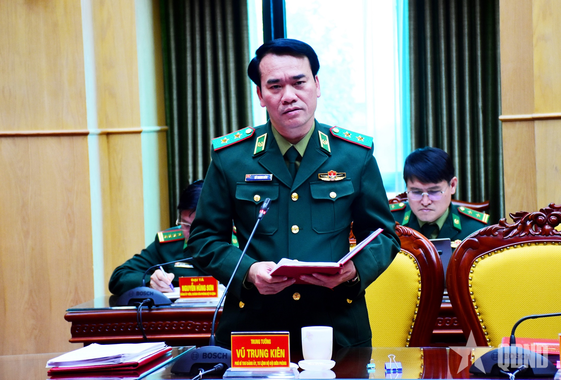 | ឧត្តមសេនីយ៍ឯក វ៉ូ ទ្រុងគៀន អនុលេខាគណៈកម្មាធិការបក្ស និងជាមេបញ្ជាការកងទ័ពការពារព្រំដែន បានថ្លែងសុន្ទរកថានៅក្នុងសន្និសីទ។ |