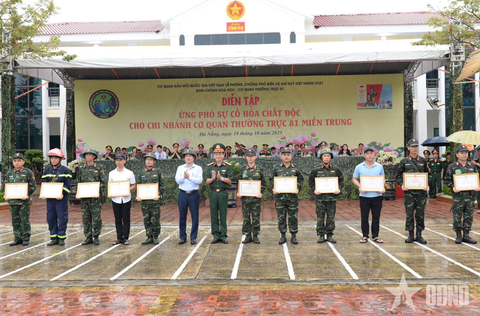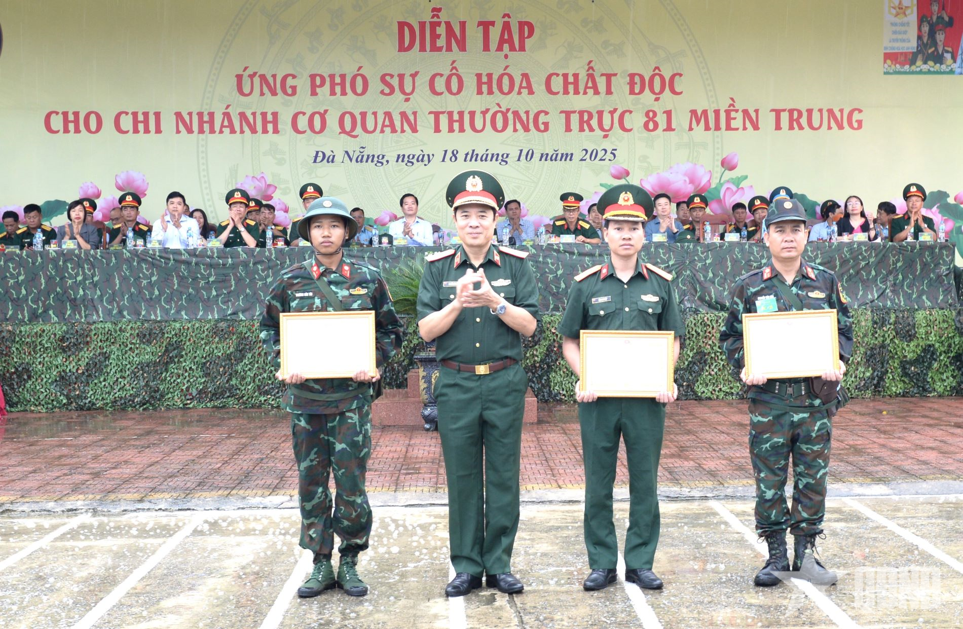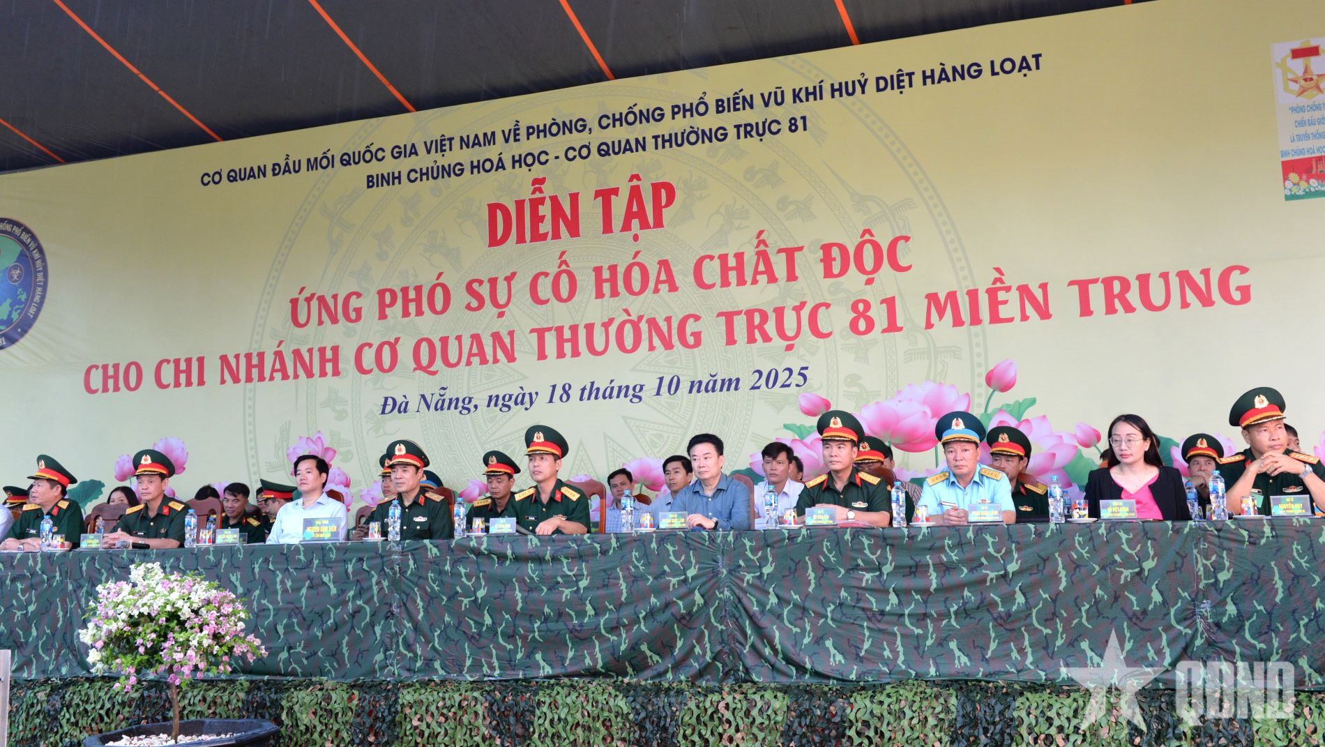 ឧត្តមសេនីយ Nguyen Dinh Hien មេបញ្ជាការកងកំលាំងគីមី និងគណៈប្រតិភូបានទស្សនា និងទស្សនាសមយុទ្ធ "ឆ្លើយតបទៅនឹងឧប្បត្តិហេតុគីមី ជីវសាស្ត្រ វិទ្យុសកម្ម និងនុយក្លេអ៊ែរ (DC-25)"។ |
