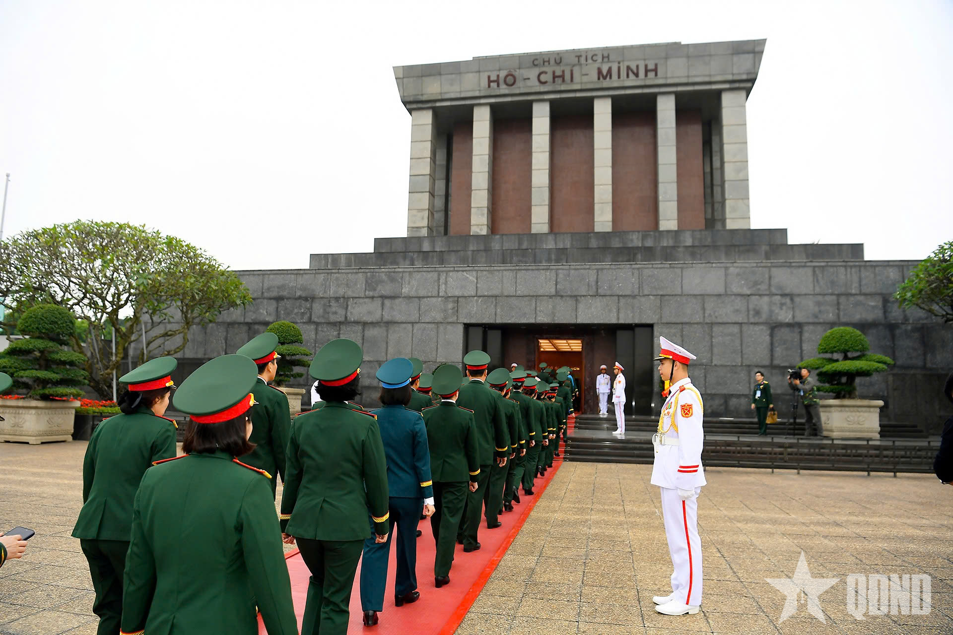 នៅចំពោះមុខរូបភាពដ៏ពិសិដ្ឋរបស់លោកប្រធានហូជីមិញ នាយទាហាន និងយុទ្ធជនស្ត្រីទូទាំងកងទ័ពបានសម្តែងការគោរពយ៉ាងជ្រាលជ្រៅ និងការដឹងគុណដ៏គ្មានព្រំដែនចំពោះការរួមចំណែករបស់លោក ហើយបានសន្យាថានឹងប្រកាន់ខ្ជាប់នូវស្មារតីទទួលខុសត្រូវខ្ពស់ ជម្នះរាល់ការលំបាកទាំងអស់ដោយសកម្ម សកម្ម និងច្នៃប្រឌិត រក្សាភក្ដីភាពយ៉ាងខ្ជាប់ខ្ជួនចំពោះបក្ស លើកកម្ពស់ការសិក្សា និងការធ្វើត្រាប់តាមគំនិត សីលធម៌ និងរចនាបថរបស់លោកហូជីមិញ និងបន្តដើរលើមាគ៌ាដែលបក្ស និងលោកប្រធានហូជីមិញបានជ្រើសរើស ដែលសក្តិសមនឹងពាក្យមាសទាំងដប់ដែលគណៈកម្មការយោធាកណ្តាលបានប្រគល់ជូននារីកងទ័ព៖ «ស្នេហាជាតិ រួបរួម ច្នៃប្រឌិត ស្មោះត្រង់ និងមានសមត្ថភាព»។