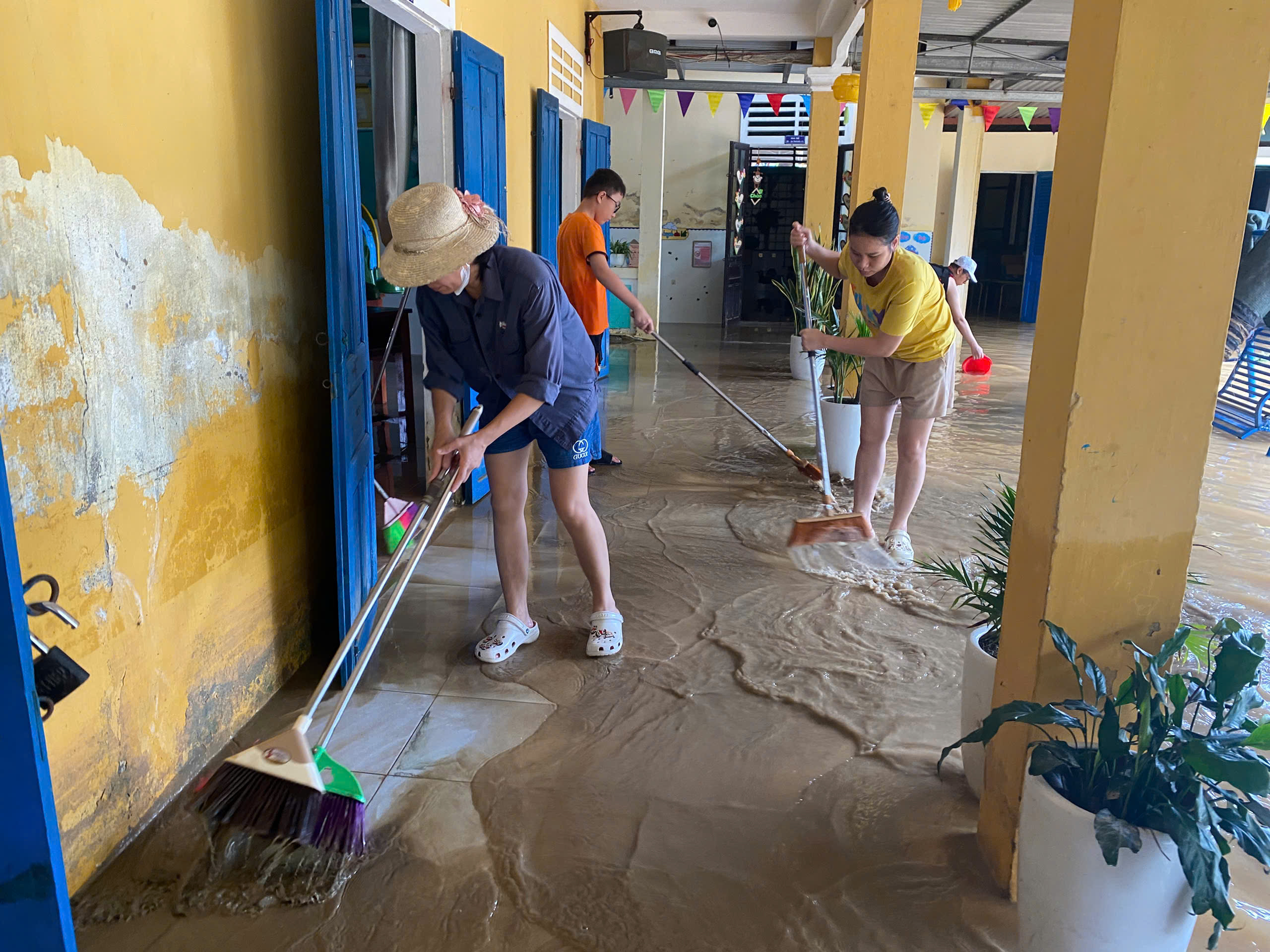 | ឆ្លៀតពេលទឹកជំនន់ស្រក លោកគ្រូអ្នកគ្រូនៅសាលាមត្តេយ្យ Phu Duong (វួដឌួងគ្មាន) បានសម្អាត។ |